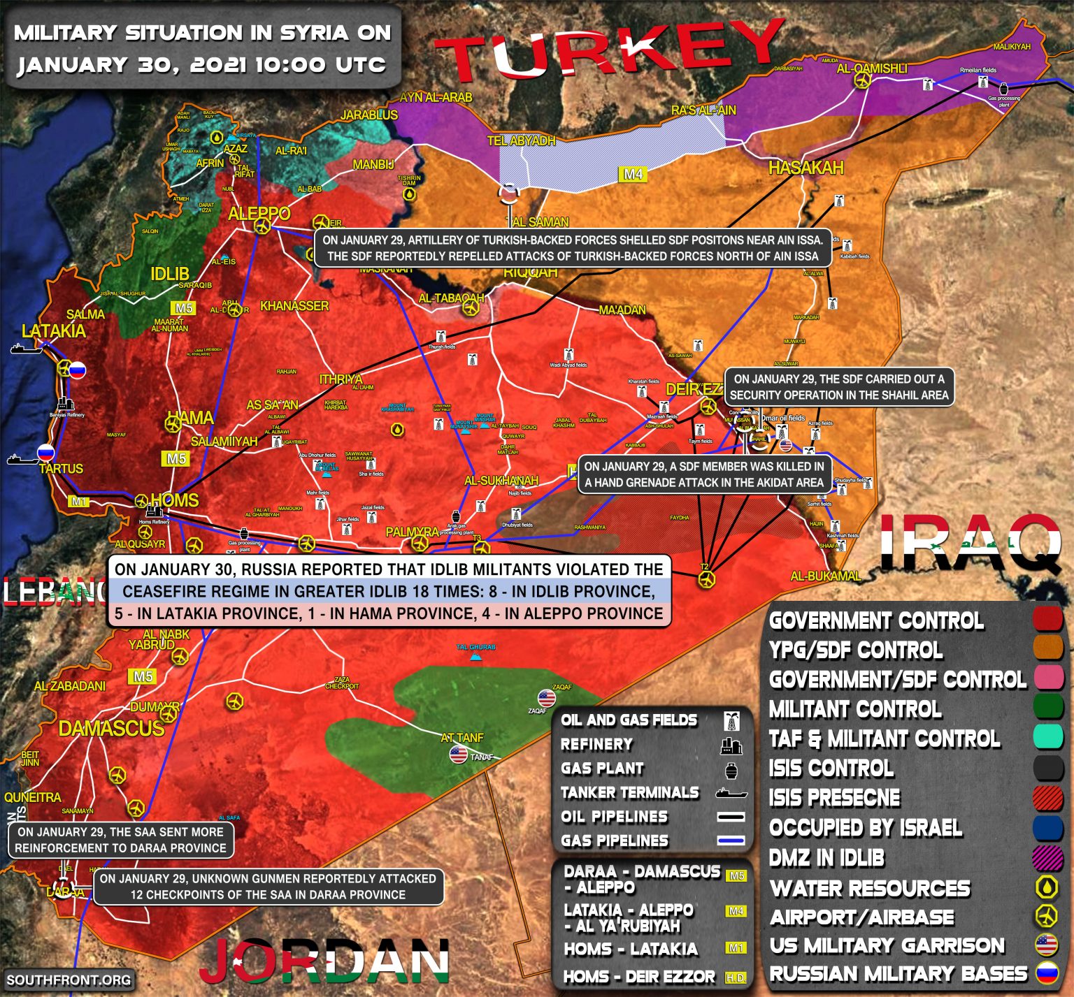 30. januára Rusko informovalo, že militanti Idlibu porušili režim prímeria vo Veľkom Idlibe 18-krát: 8 - v provincii Idlib, 5 - v provincii Latakia, 1 - v provincii Hamá, 4 - v provincii Aleppo;
