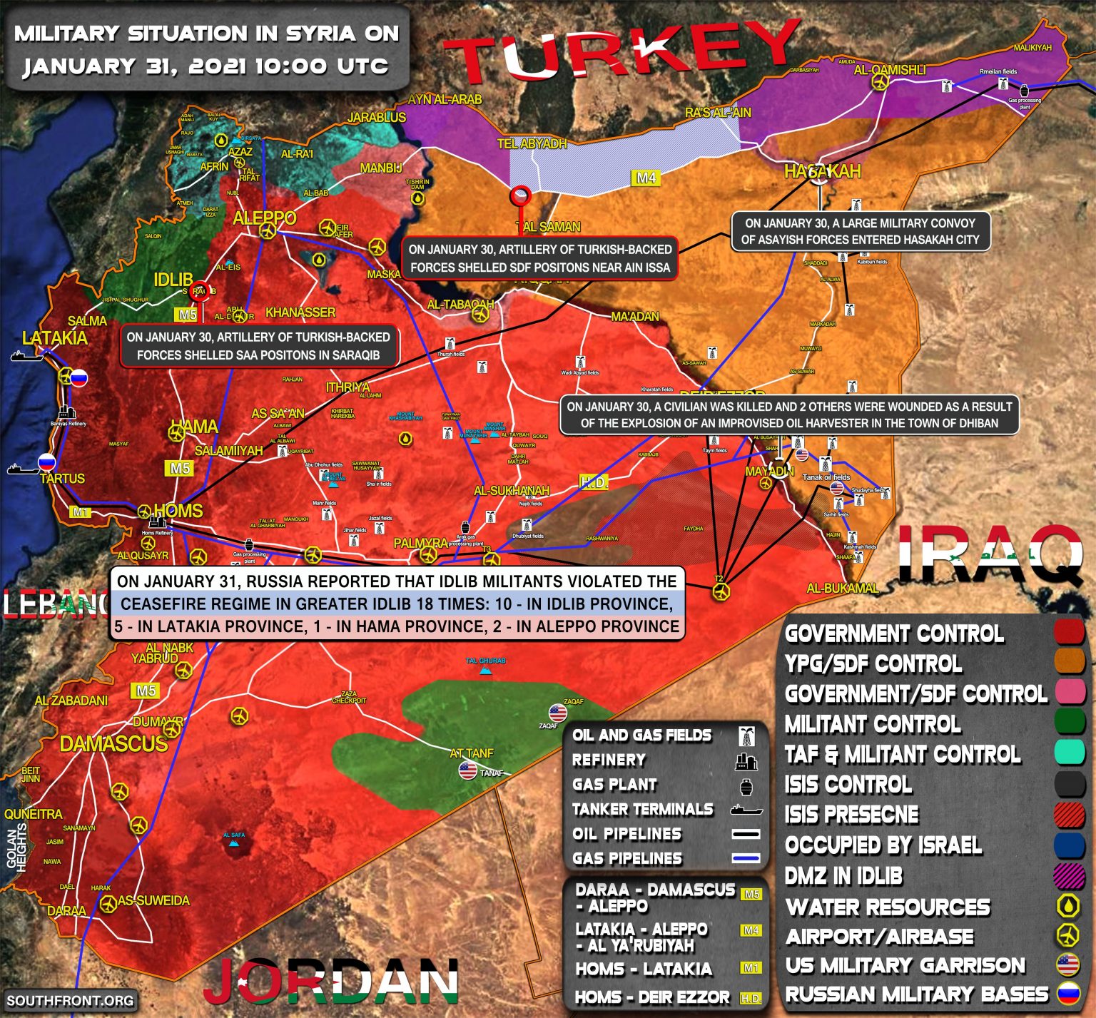 31. januára Rusko informovalo, že militanti Idlibu porušili režim prímeria vo Veľkom Idlibe 18-krát: 10 - v provincii Idlib, 5 - v provincii Latakia, 1 - v provincii Hamá, 2 - v provincii Aleppo;
