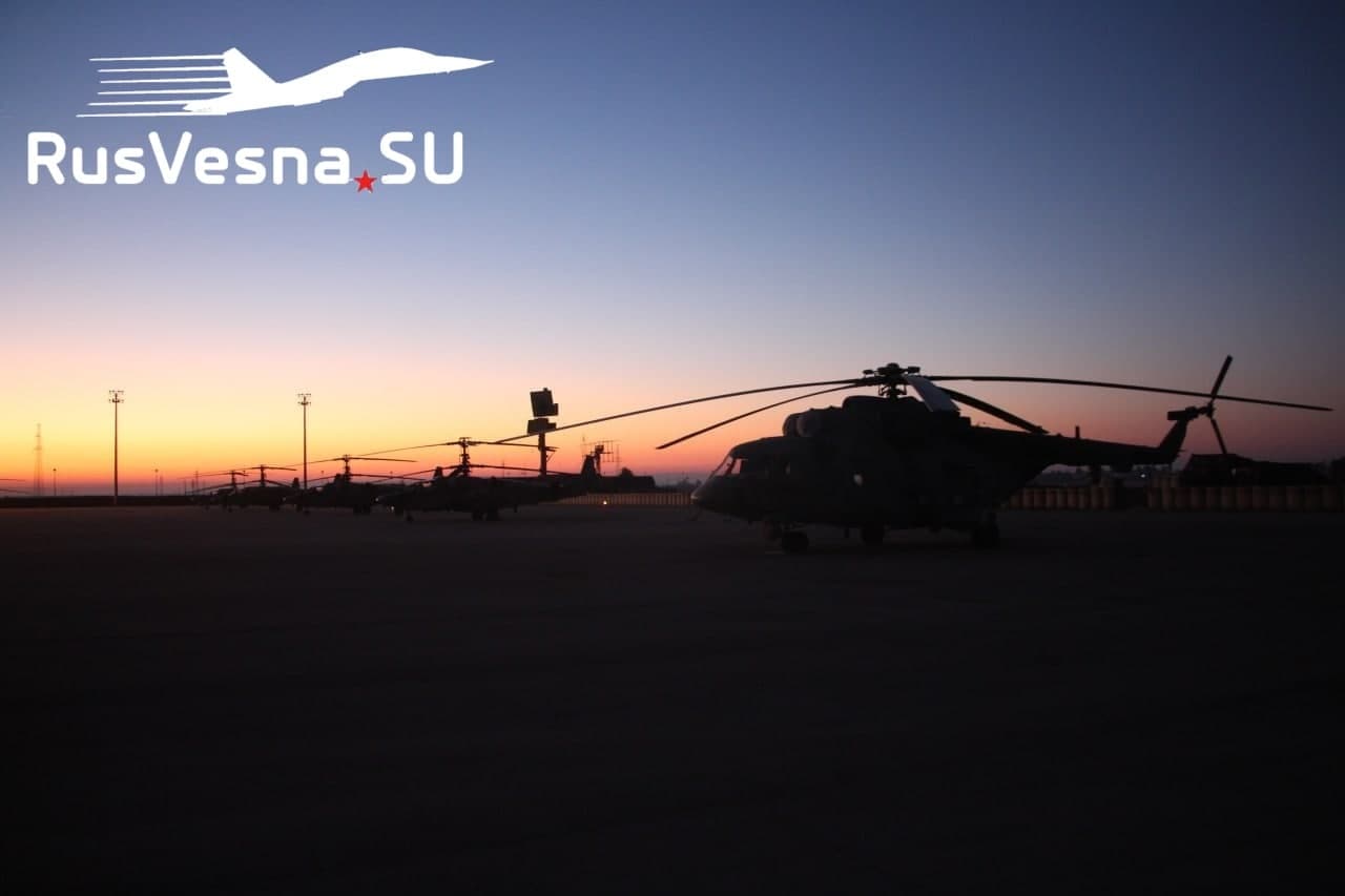 Na oblohu vzlétají stíhačky Su-35S a bitevní vrtulníky Ka-52. Kontrolu vzdušného prostoru nad leteckou základnou Hmímim provádí letoun včasné výstrahy A-50U.