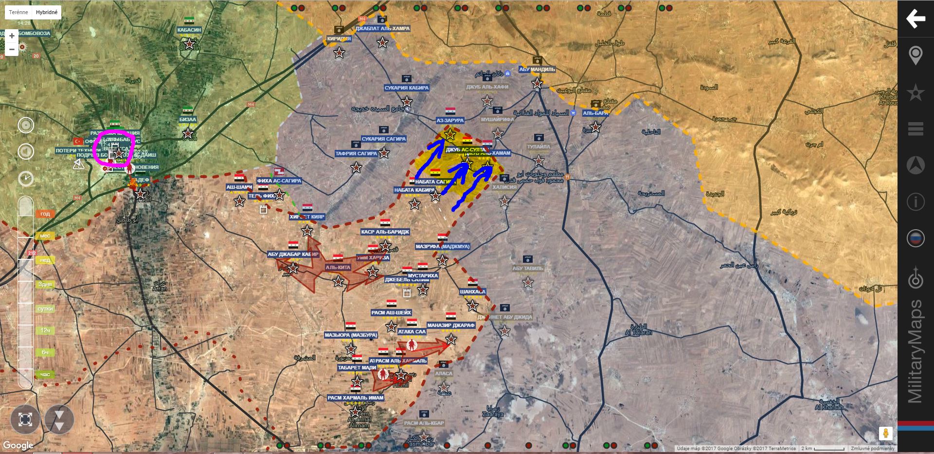 Syrská armáda pokračuje v útok na pozice ozbrojenců organizace Islámský Stát, nedaleko od letecké základny Kuvejris. Stojí za to připomenout, že včera syrská armádou a Tiger force vyhnali ozbrojence Islámského státu z velkého množství obcí a výšk, takových jak Salim, Kasr al-Burejdž, Umm-Charza, Mustaricha Meri, Al - Kyta, Al-Džadida, Al-Mazrufa, Chirbet Kabbar, Šanchasu, Aš - Šami a Ruvejdu al - Bab.