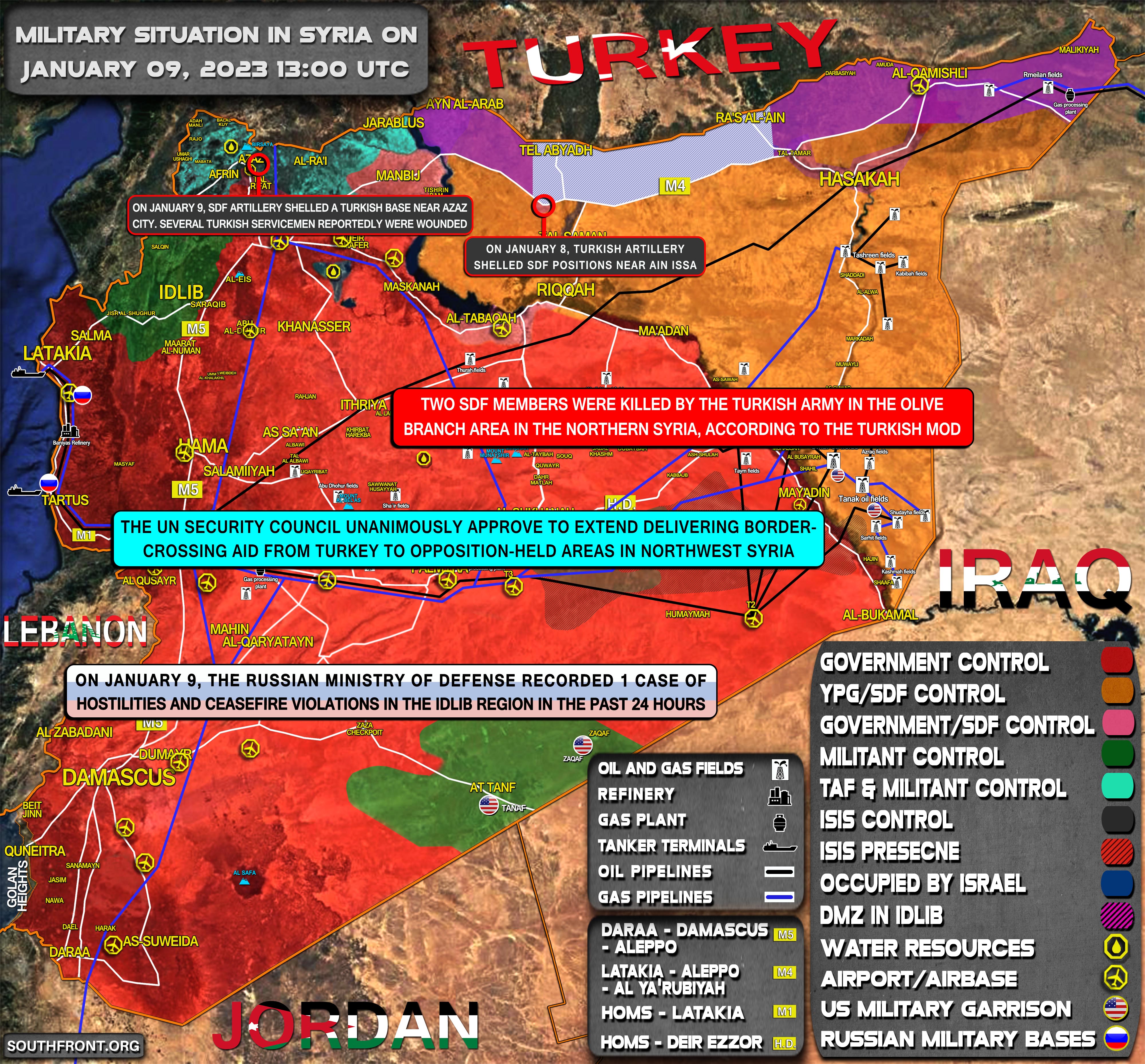 9. januára delostrelectvo SDF ostreľovalo tureckú základňu neďaleko mesta Azaz. Niekoľko tureckých vojakov bolo údajne zranených;