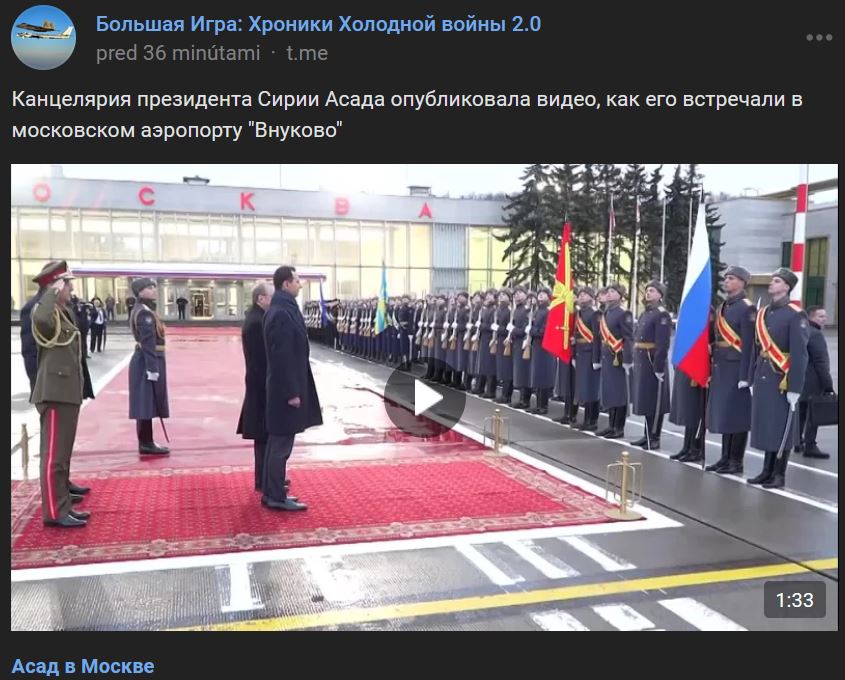 Kancelária prezidenta Sýrie Asada zverejnila video z jeho privítania na moskovskom letisku Vnukovo (Внуково)