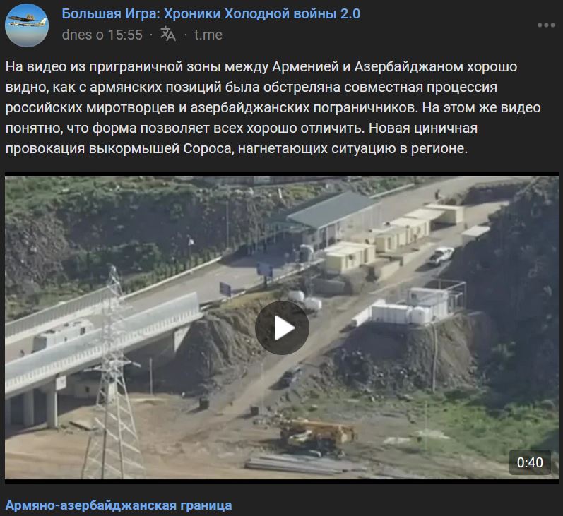 Na videu z pohraničnej zóny medzi Arménskom a Azerbajdžanom je jasne vidieť spoločný sprievod ruských mierových síl a azerbajdžanských pohraničníkov, na ktorých strieľajú arménske pozície. Na tom istom videu je tiež jasne vidieť, že vďaka uniformám sú všetci jasne rozlíšiteľní. Nová cynická provokácia zo strany Sorošovho krmiva, ktorá vyhrocuje situáciu v regióne.