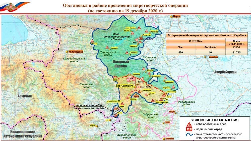 Stav k sobote 19.12.2020, rozmiestnenie Ruských mierových síl v Náhornom Karabachu = modrou ohraničená zóna je pod ochranou Ruska Zdroj https://vk.com/wall-123538639_1712303 z 20.12.2020