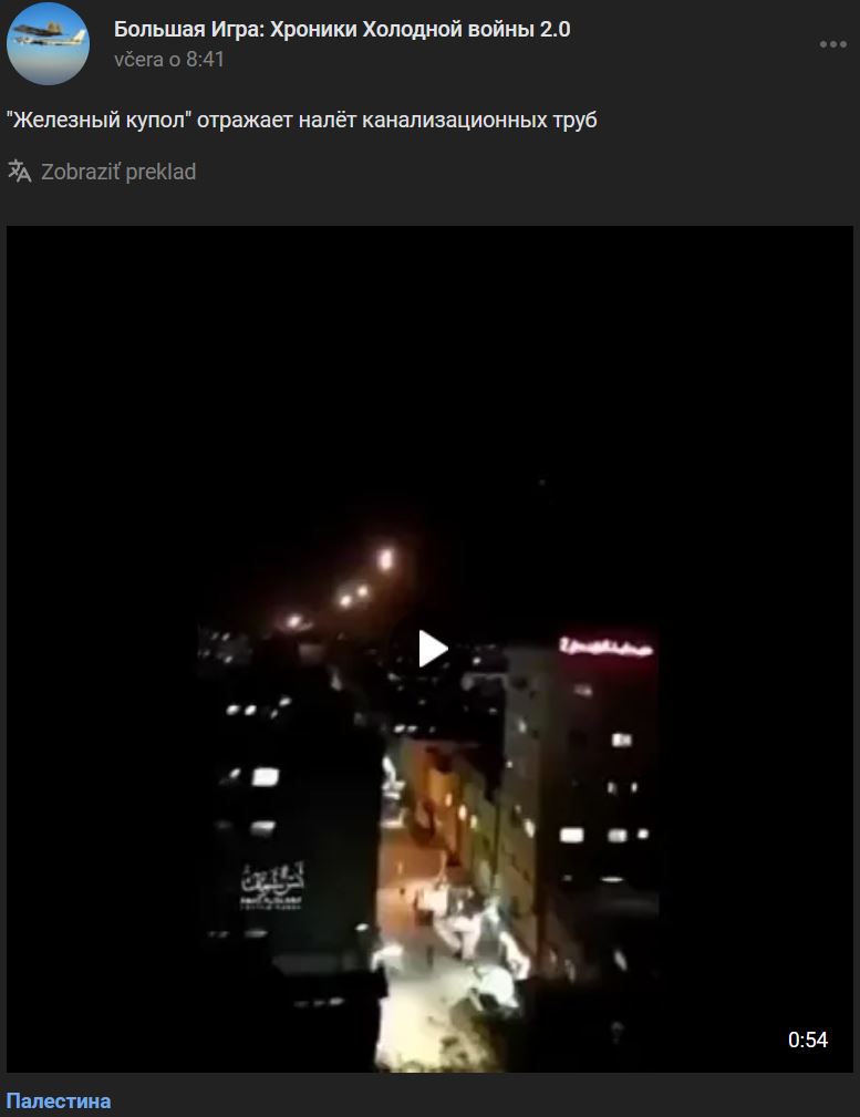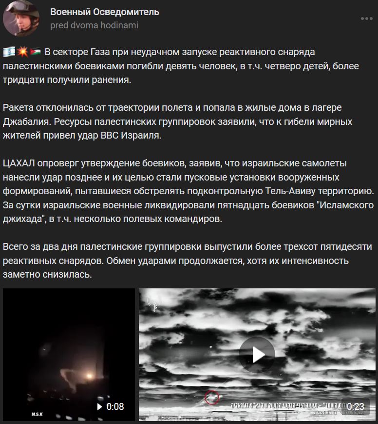 Len za 2 dni palestínske skupiny vystrelili viac ako 350 rakiet. Útoky sa naďalej vymieňajú, hoci ich intenzita sa výrazne znížila. Video 1 https://vk.com/video-123538639_456287830 dĺžka 8 sek. = zlyhanie podomácky vyrobenej rakety