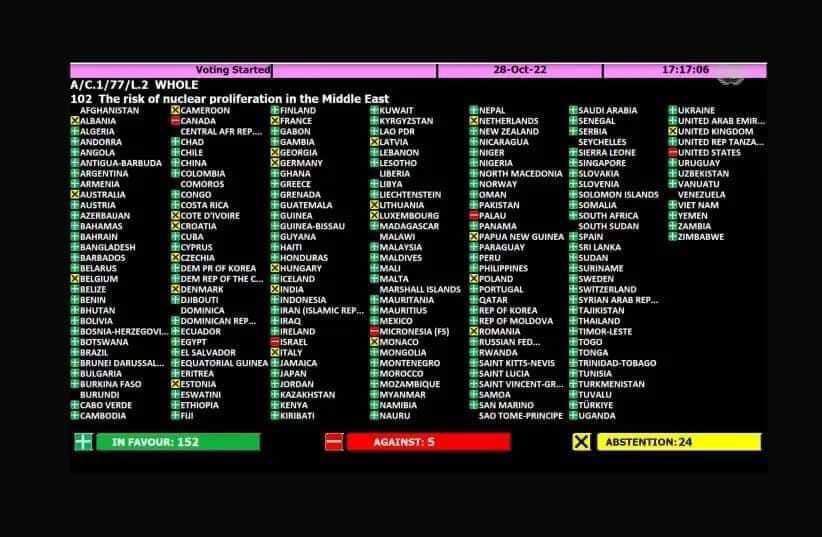 https://t.me/spletnicca/7664Původní hlasování pro příslušnou rezoluci Valného shromáždění OSN bylo 152 hlasů pro, 5 proti a 24 se zdrželo hlasování. Proti hlasoval samotný Izrael, Kanada, Spojené státy, Mikronésie a Palau.