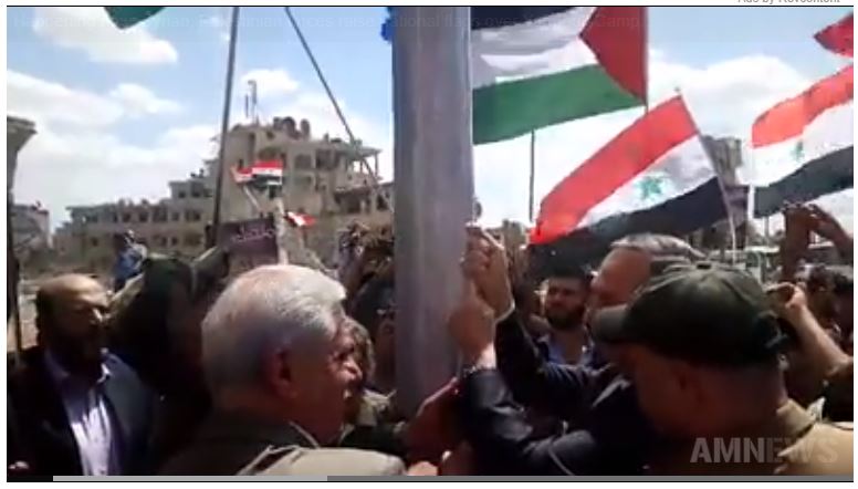 Slávnostné vztýčenie sýrskej vlajky sa uskutočnilo na 30. ulici v Yarmuku, kde sa uskutočnili niektoré z najsilnejších bitiek. Video v odkaze: