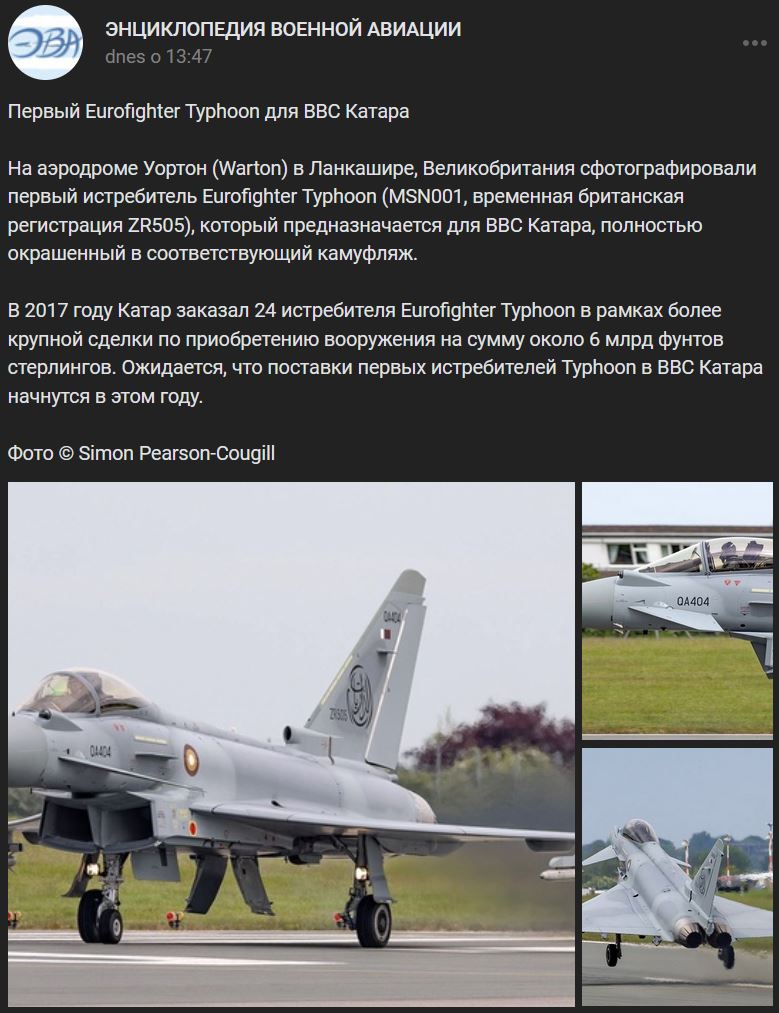 Na letisku Warton vo Veľkej Británii bol odfotografovaný prvé lietadlo rodiny Eurofighter Typhoon (MSN001, dočasná britská registrácia ZR505) pre katarské vzdušné sily, kompletne natretý v zodpovedajúcej kamufláži. Katar si v roku 2017 objednal 24 lietadiel rodiny Eurofighter Typhoon ako súčasť väčšieho zbrojného obchodu v hodnote približne 6 miliárd libier. Dodávky prvých lietadiel Typhoon pre katarské vzdušné sily sa majú začať tento rok 2022. Zdroj https://t.me/AviaCT/15830 + klon https://vk.com/wall-173678697_263834 z 10.05.2022 + lepšie foto