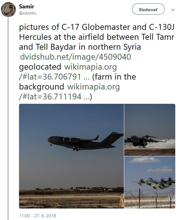 Severná Sýria (niekde medzi Tell Tamr a Tell Baydar = odkaz na WikiMapia) - US transportné lietadlá C-17 Globemaster and C-130J Hercules