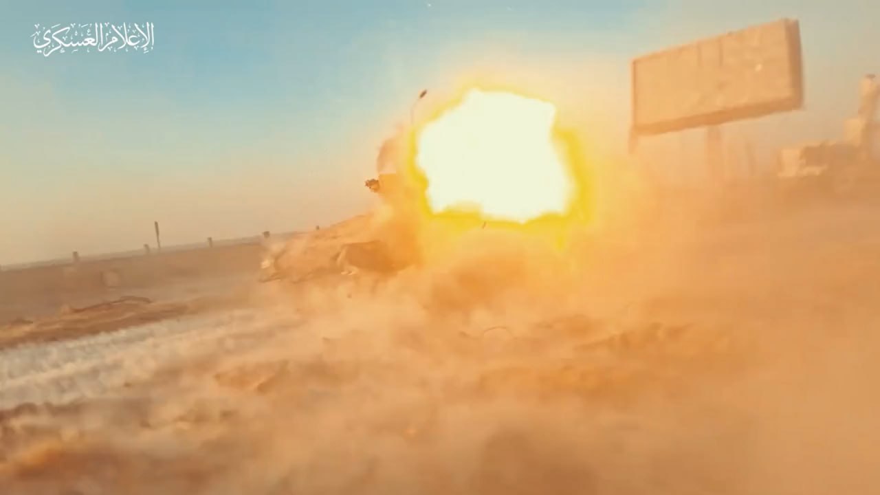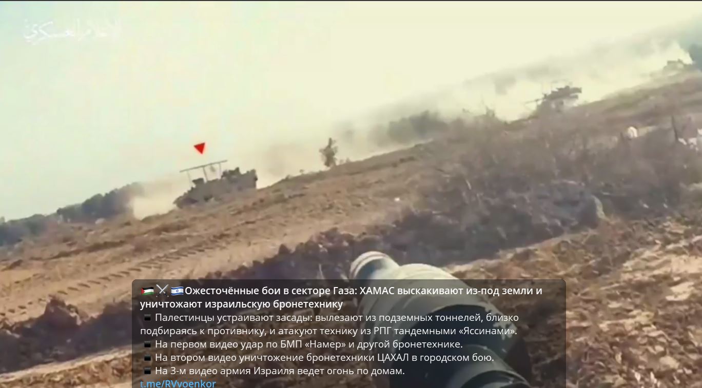 zostrih zasahov Hamasu na IDF techniku. z videa nieje mozne vidiet ucinok zasahov.