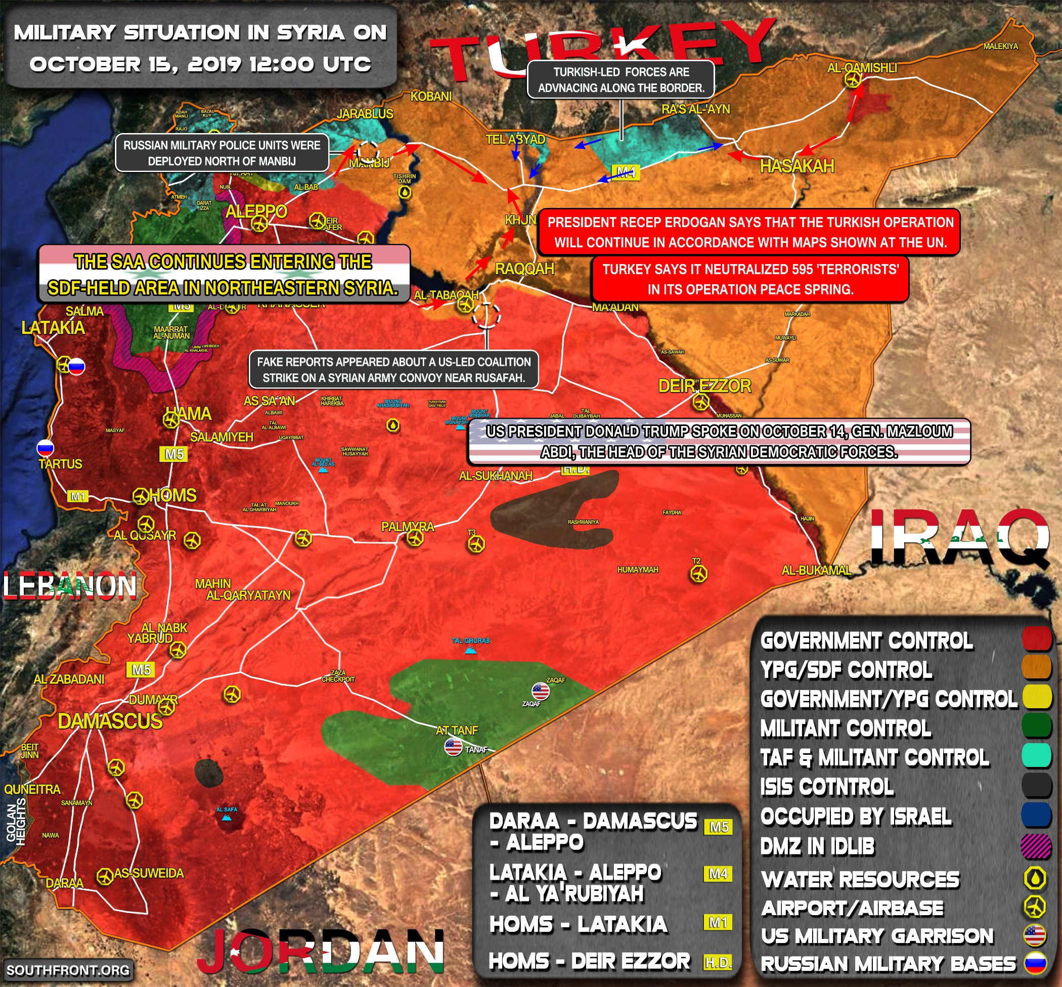 Ministerstvo obrany Ruské federace zveřejnilo mapu znázorňující oblasti, které jsou k 15. říjnu 2019 pod kontrolu syrských vládních sil.