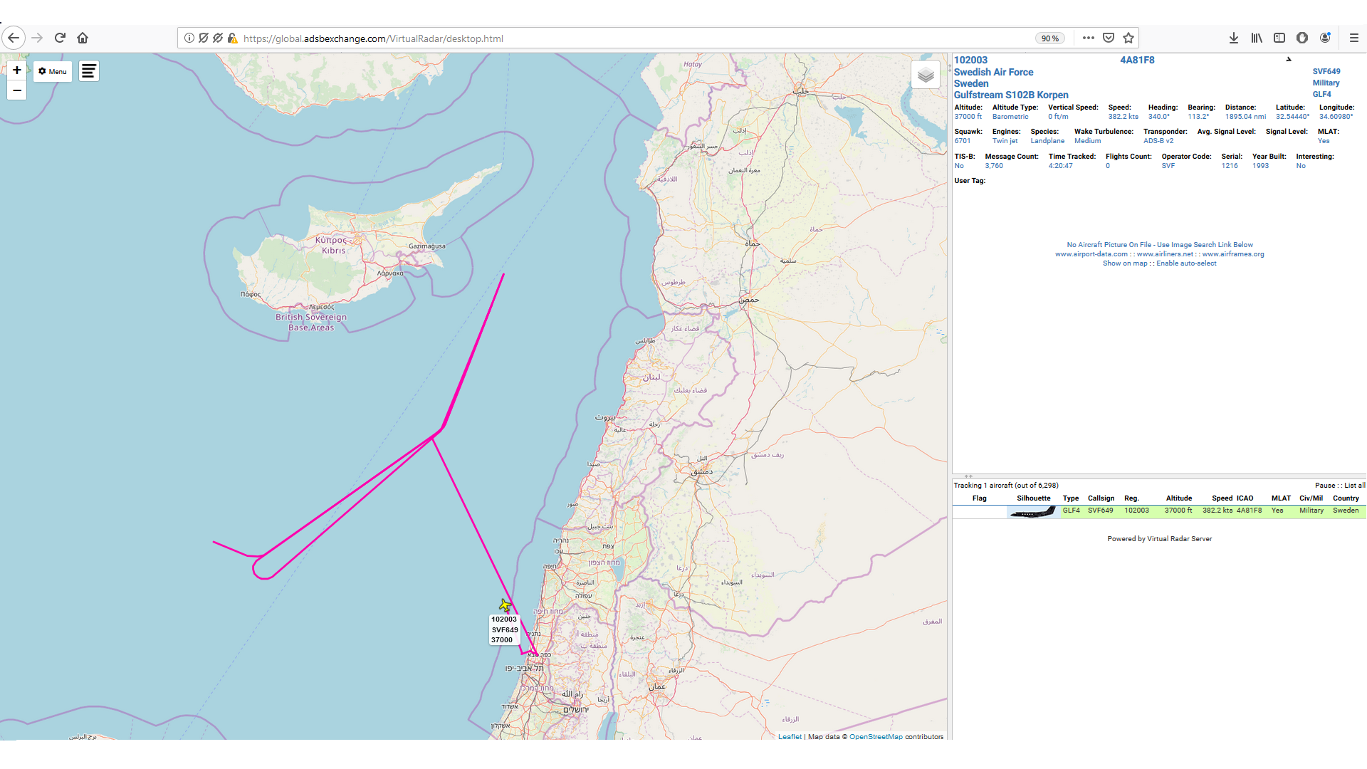 Švédsky Gulfstream S102B Korpen šmíruje situáciu vo Východnom Stredomorí
