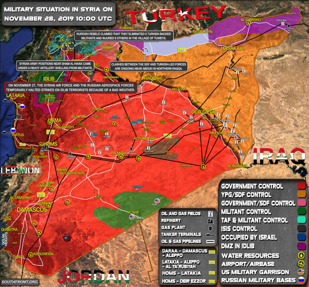 SyAAF a ruské letecké síly zastavily své operace 27. listopadu. Špatné počasí bylo pravděpodobně důvodem překvapivého zastavení náletů, protože severozápadní Sýrie byla svědkem silné dešťové bouře. Očekává se, že během příštích 24 hodin bude jasno. To poskytne syrské arabské armádě (SAA) šanci obnovit její omezenou pozemní operaci v jihovýchodní Idlibském kraji.