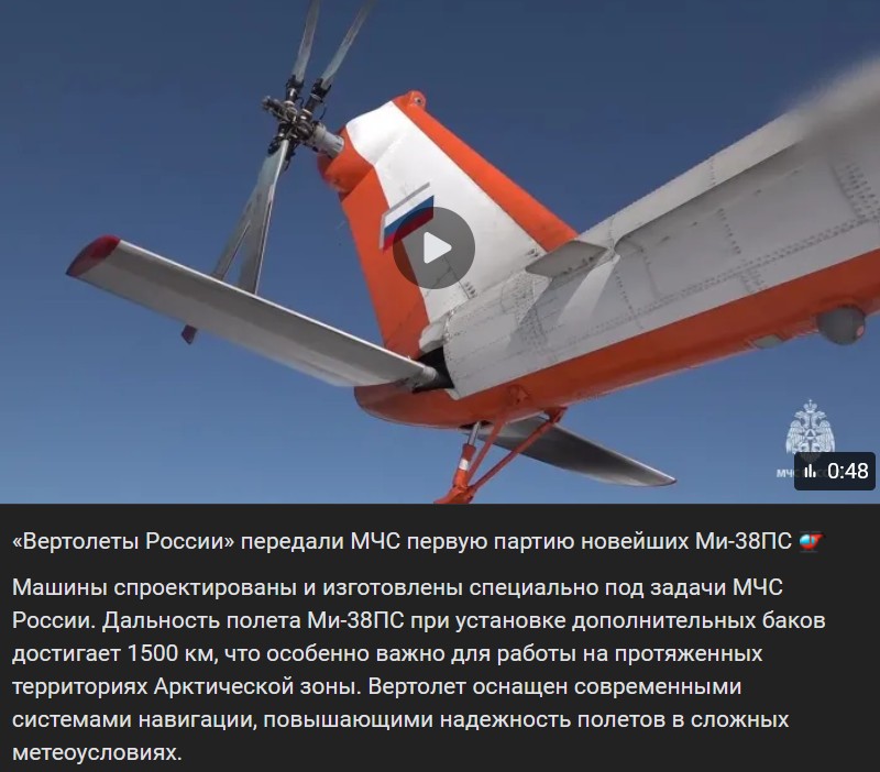 „Ide o úplne domáce letecké zariadenie, vytvorené s ohľadom na požiadavky a želania MČS Ruska. V prvom rade sa to týka zvýšenia doletu. Pre nás to bolo dôležité: vrtuľníky Miľ Mi-38PS (Ми-38ПС) budú slúžiť v arktickej zóne, kde pokračujeme v postupnom vytváraní leteckých záchranných jednotiek.“