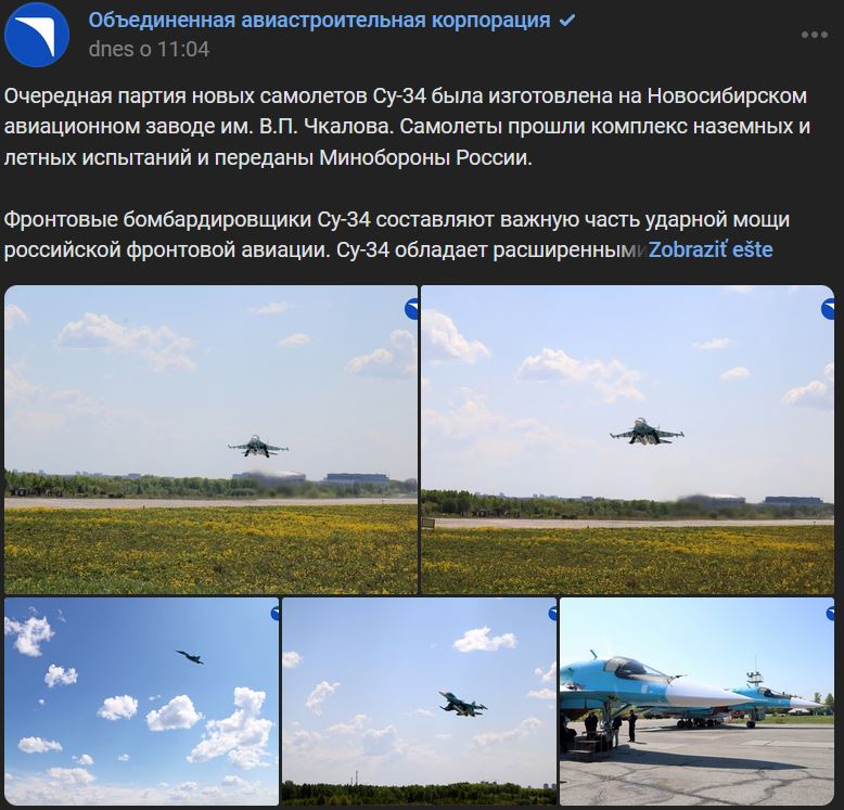 "OAK (ОАК) dodáva lietadlá v rámci programu na tento rok 2023. Nedávno bol VTA (ВТА) odovzdaný ďalší IL-76MD-90A (viď1 viď2 ). Séria lietadiel Su-34 je prvou tohtoročnou dodávkou operačno-taktických lietadiel. OAK, ktorý je súčasťou spoločnosti Rostech, má najdôležitejšiu úlohu - dodať ruskému ministerstvu obrany nové vysokovýkonné lietadlá," povedal generálny riaditeľ OAK Jurij Sljusar (Юрий Слюсарь). Svoje záväzky vyplývajúce zo štátnej objednávky v oblasti obrany plníme včas a spolu s armádou vykonávame potrebné práce na udržanie lietadiel v prevádzke." Zdroj https://vk.com/wall-211699782_6009 z 01.06.2023 + 5 kvalitnejších foto