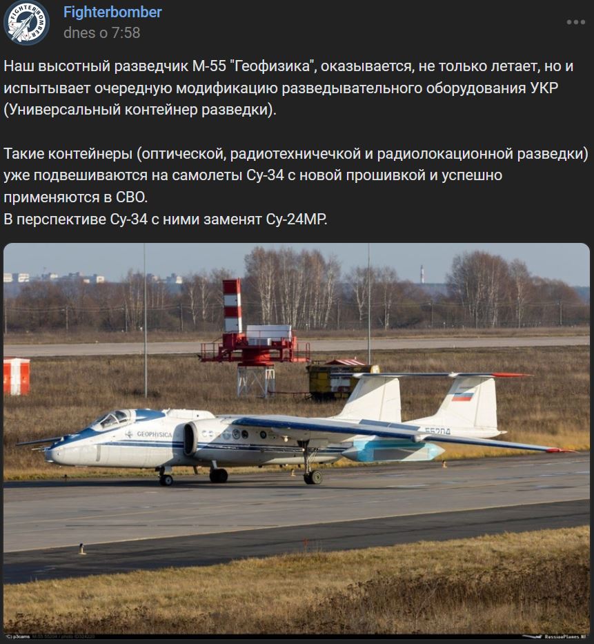 Ukazuje sa, že náš výškový prieskumník, lietadlo Mjasiščev M-55 "Geofizika" (Геофизика) nielen lieta, ale aj testuje ďalšiu modifikáciu prieskumného zariadenia UKR (УКР = Универсальный контейнер разведки / Univerzálny kontajner prieskumu).