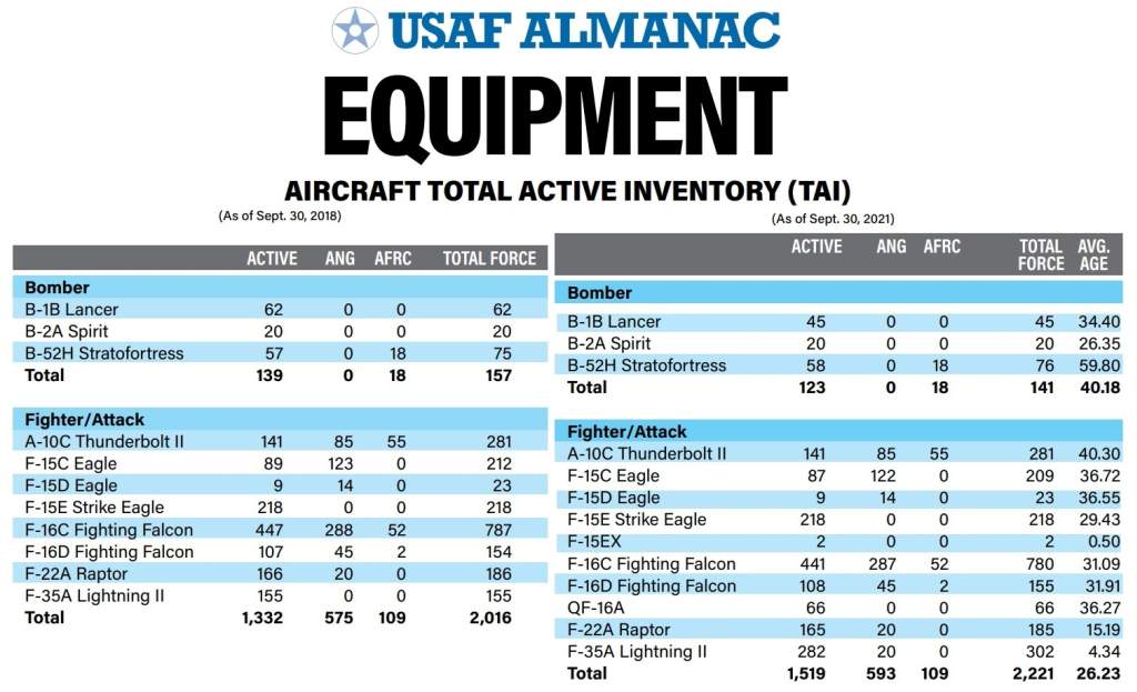 Na záver niekoľko všeobecných údajov o letectve USA ako celku. Na konci 09/2021 bol celkový počet lietadiel v štruktúre (lietadlá, vrtuľníky, UAV, výcvikové atď.) = 5564 (5484 v roku 2011, nárast za 10 rokov o 80 kusov), priemerný vek 27,5 roka, priemerná bojová pohotovosť 71,5 %. Zdroj https://vk.com/wall-173678697_287263 z 26.09.2022 + kvalitnejšie foto, ktorý čerpal z https://www.airandspaceforces.com/