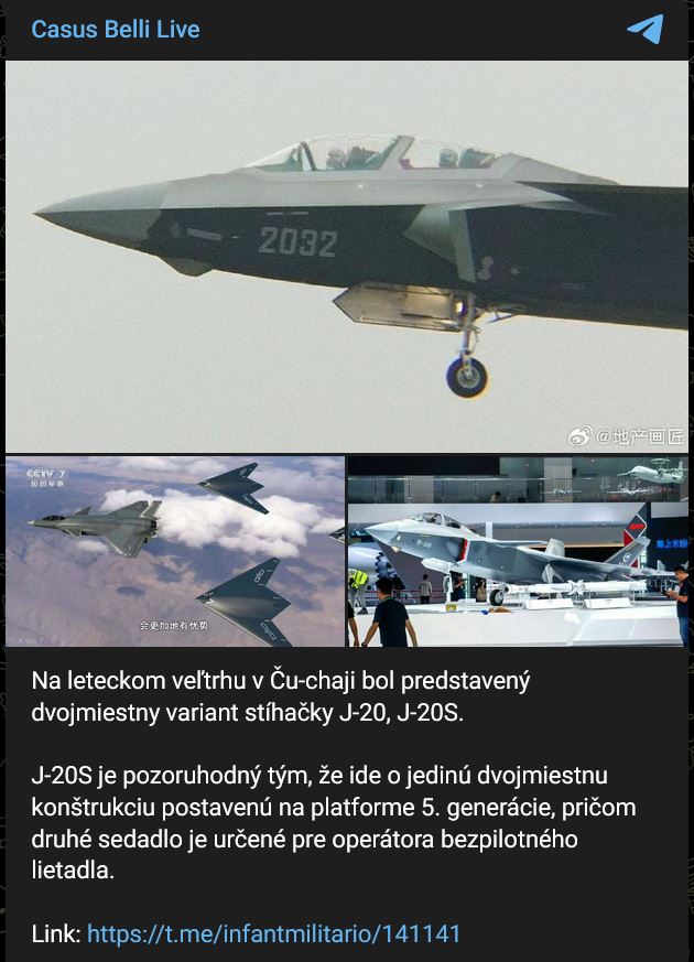 Na leteckom veľtrhu v Ču-chaji bol predstavený 2-miestny variant stíhačky J-20, J-20S.
