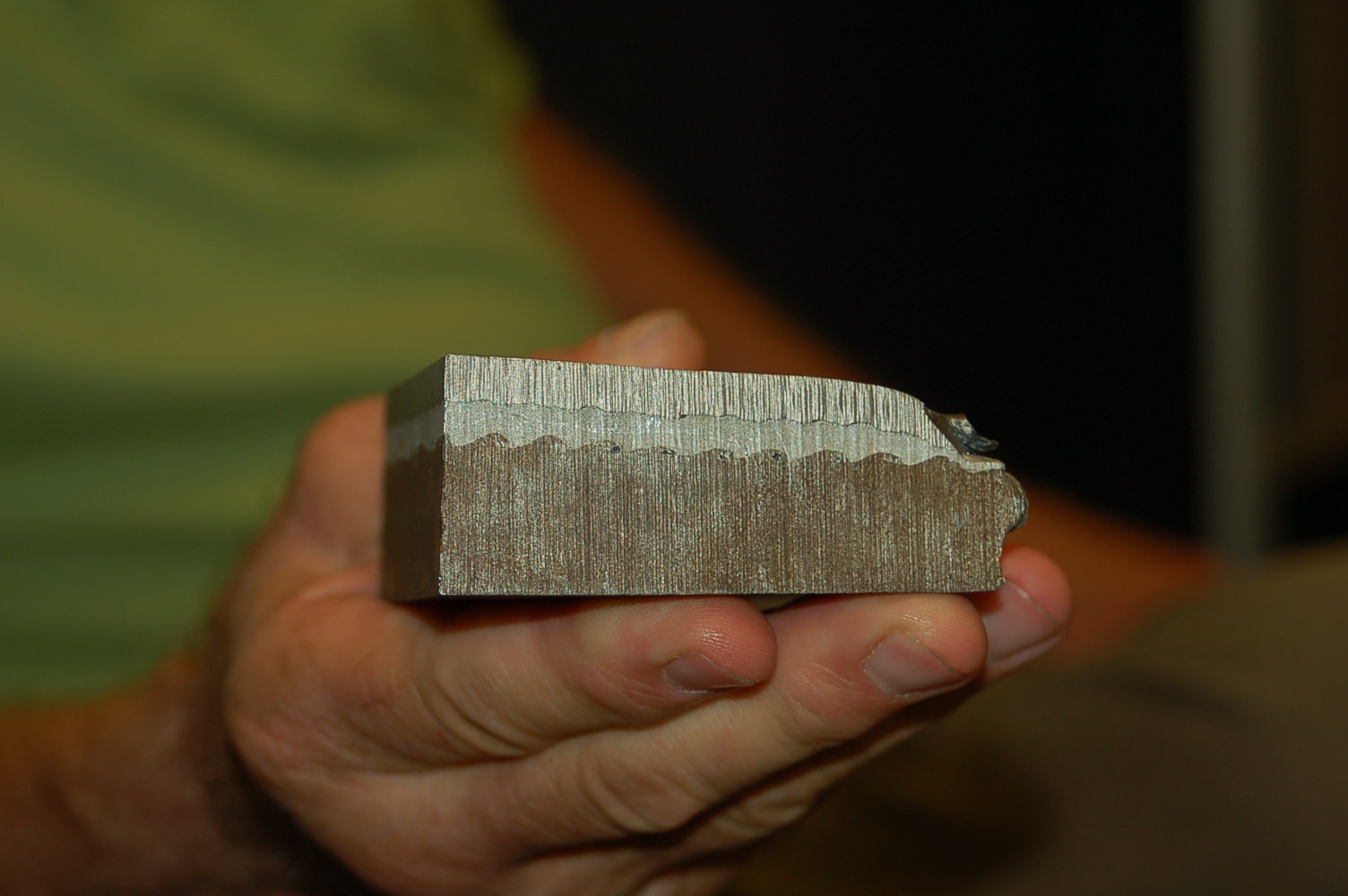 druhá vzorka zprava - štvorvrstvý zvarenec zvarený výbuchom - oceľ (zrejme triedy 10), meď, titan, dural