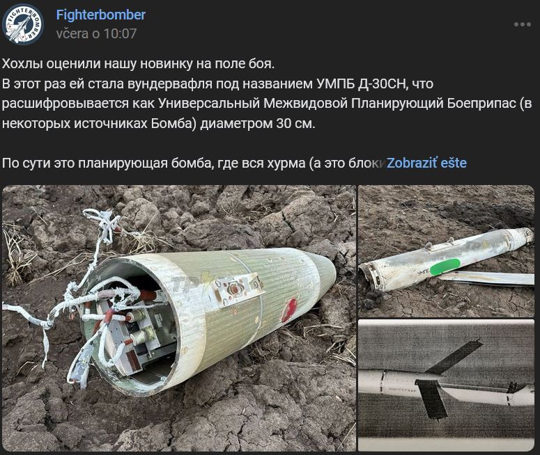 Zdroj https://vk.com/wall-182816816_88087 / https://t.me/fighter_bomber/15936 z 09.03.2024Tentoraz to bola "wunderwaffla" s názvom UMPB D-30SN (УМПБ Д-30СН), čo je skratka pre "Univerzálna Medzidruhová Vztlaková Munícia" { Универсальный Межвидовой Планирующий Боеприпас } (v niektorých článkoch proste Bomba) s priemerom 30cm.
