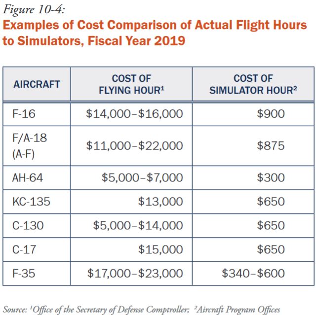 F-16 sú 14-16 tisíc $, náklady na 1 hodinu letu na letovom simulátore F-16 nepresahujú 900 $. Pre lietadlo F/A-18 sú tieto čísla 11-22 tisíc $ a 875 $. Pre vrtuľník AH-64 = 5-7 tisíc $ a 300 $. Letová hodina tankera KC-135 sa odhaduje na 13 000 $, na simulátore je tréningová hodina 650 $.