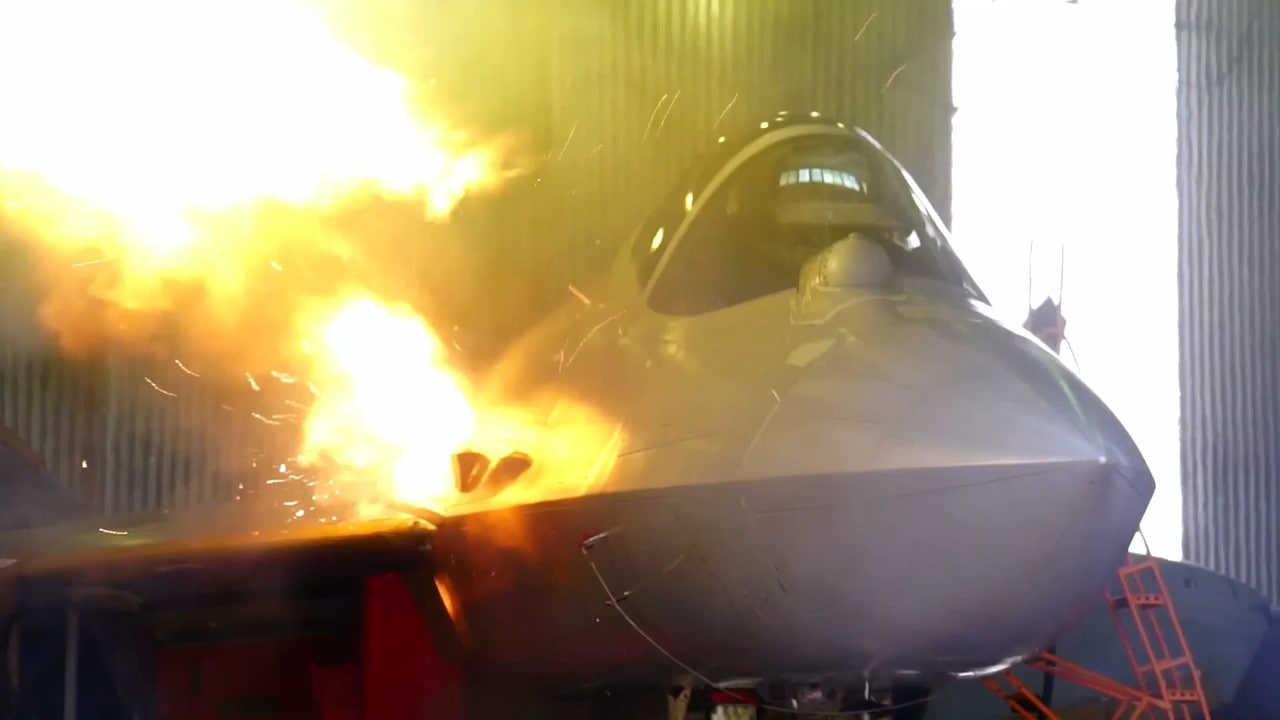 Pozemní zkušební střelba modernizované verze 30mm letadlového kanónu GSh-30-1 (9-A-4071K), které je součástí výzbroje stíhačky Su-57
