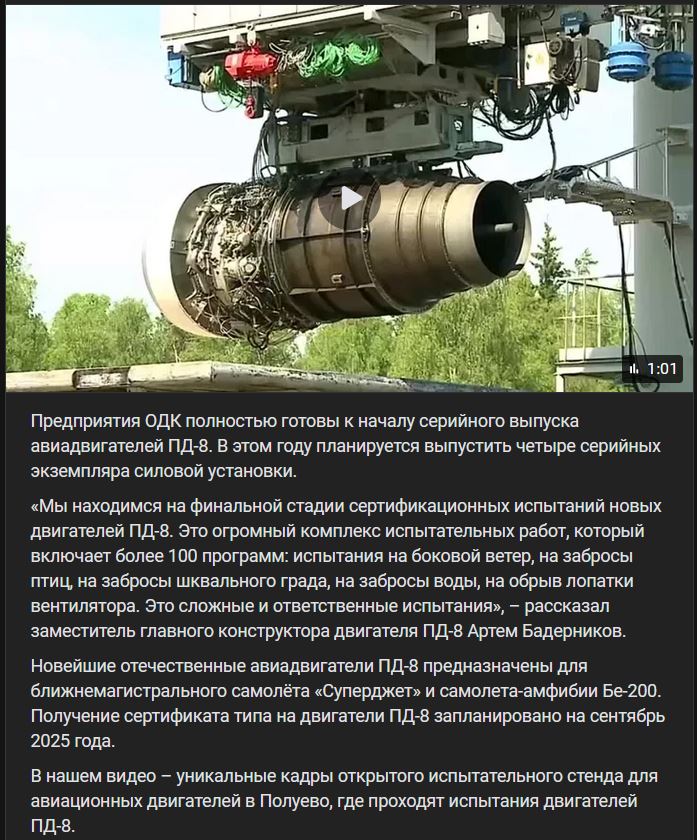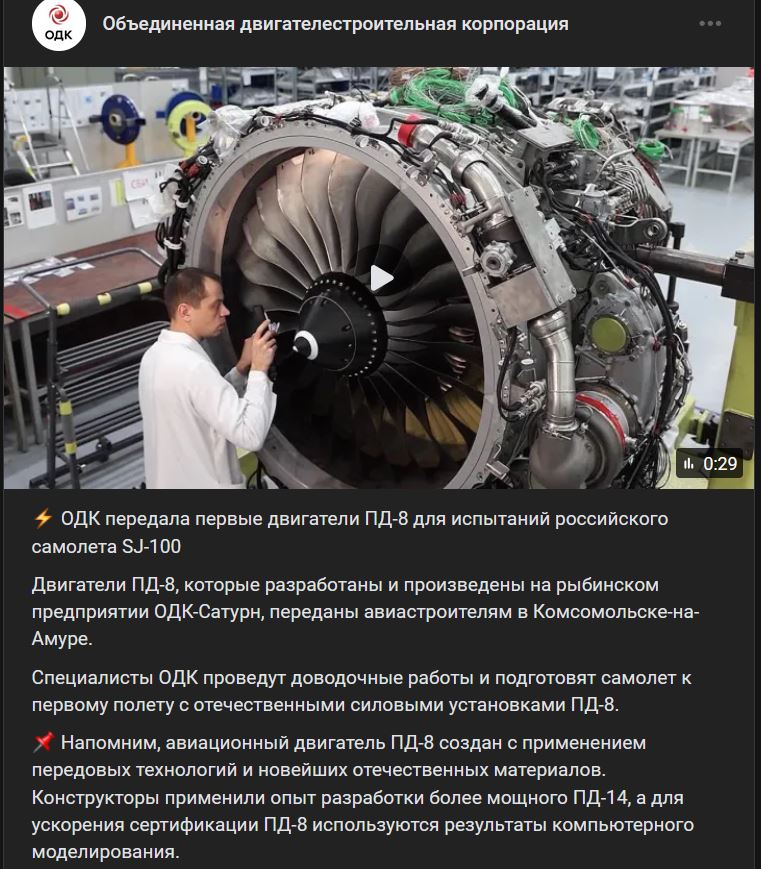 V Jaroslavskej oblasti vykonala ODK dôležité testy najnovšieho leteckého motora PD-8 (ПД-8), určeného pre lietadlo Superjet. Počas prevádzky pohonného agregátu bola zámerne poškodená jedna z lopatiek ventilátora. Ako sa zariadenie s týmto problémom vyrovnalo, opísala korešpondentka televízneho kanálu Rusko 24.