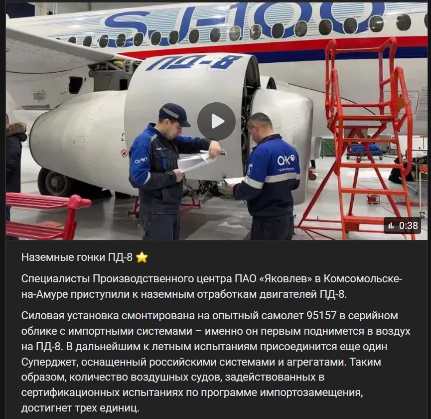 Špecialisti Výrobného strediska PAO "Jakovlev" (Яковлев) v Komsomoľsku na Amure začali pozemné skúšky motorov PD-8 (ПД-8). Pohonná jednotka je namontovaná na prototype lietadla 95157 v sériovej podobe s dovezenými systémami - bude prvou, ktorá sa dostane do vzduchu na lietadle PD-8. V budúcnosti sa k letovým skúškam pripojí ďalší Superjet vybavený ruskými systémami a agregátmi. Počet lietadiel zapojených do certifikačných skúšok v rámci programu náhrady dovozu tak dosiahne 3 jednotky.