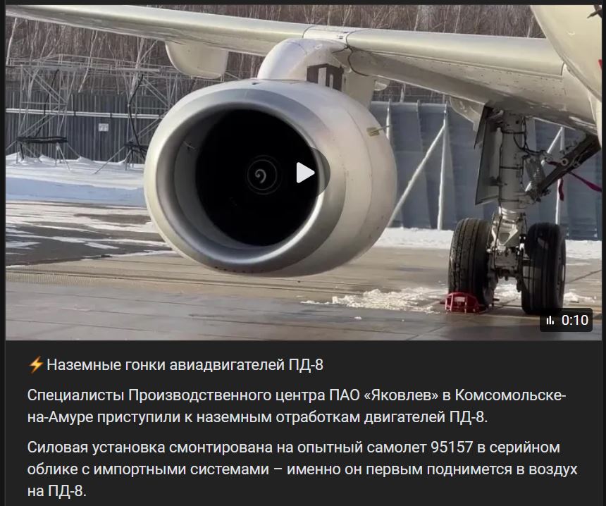 "Nachádzame sa v záverečnej fáze certifikačných testov / skúšok nových motorov PD-8 (ПД-8). Ide o obrovský súbor skúšobných prác, ktorý zahŕňa viac ako 100 programov: skúšky na bočný vietor, nasatie vtákov, prevádzka počas krupobitia, silného dažďa (veľa vody), poškodenie lopatiek ventilátora. Ide o komplexné a zodpovedné testy," povedal Artem Badernikov (Артем Бадерников), zástupca hlavného konštruktéra motora PD-8 (ПД-8).