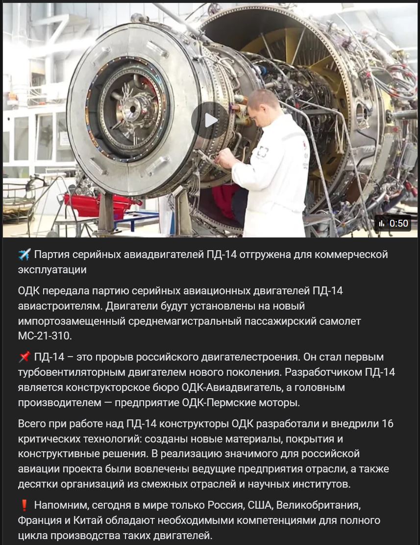 ODK (ОДК) dodala dávku sériových leteckých motorov PD-14 (ПД-14) výrobcom lietadiel. Motory sa budú montovať do domácich nových stredných dopravných lietadiel MS-21-310 (МС-21-310). PD-14 (ПД-14) predstavuje prelom v ruskom motorovom priemysle. Stal sa prvým turbovrtuľovým motorom novej generácie. Vývojárom PD-14 je konštrukčná kancelária "ODK-Aviaadvigateľ" (ОДК-Авиадвигатель) a hlavným výrobcom je "ODK-Permskije motory" (ОДК-Пермские моторы). Celkovo konštruktéri ODK pri práci na motore PD-14 vyvinuli a implementovali 16 kritických technológií: boli vytvorené nové materiály, povlaky a konštrukčné riešenia. Na realizácii projektu, ktorý je významný pre ruské letectvo, sa podieľali popredné podniky priemyslu, ako aj desiatky organizácií z príbuzných odvetví a vedeckých ústavov. Treba pripomenúť, že v súčasnosti majú potrebné kompetencie na celý cyklus výroby takýchto motorov len Rusko, SŠA, Spojené kráľovstvo, Francúzsko a Čína.