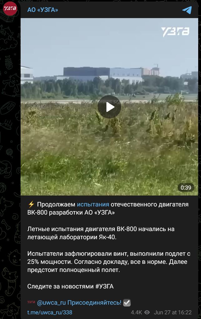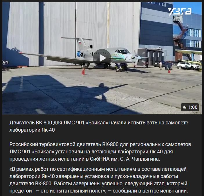 Uskutočnil sa prvý let lietajúceho laboratória s motorom VK-800 (ВК-800) vyvinutým spoločnosťou UZGA (УЗГА). Lietajúce laboratórium na základe lietadla Jakovlev Jak-40 (Як-40) spoločnosti SibNIA S.A.Čaplygina (СибНИА им С.А.Чаплыгина) uskutočnilo prvý skúšobný let s motorom VK-800 (ВК-800) vyvinutým spoločnosťou AO UZGA (АО «УЗГА»).