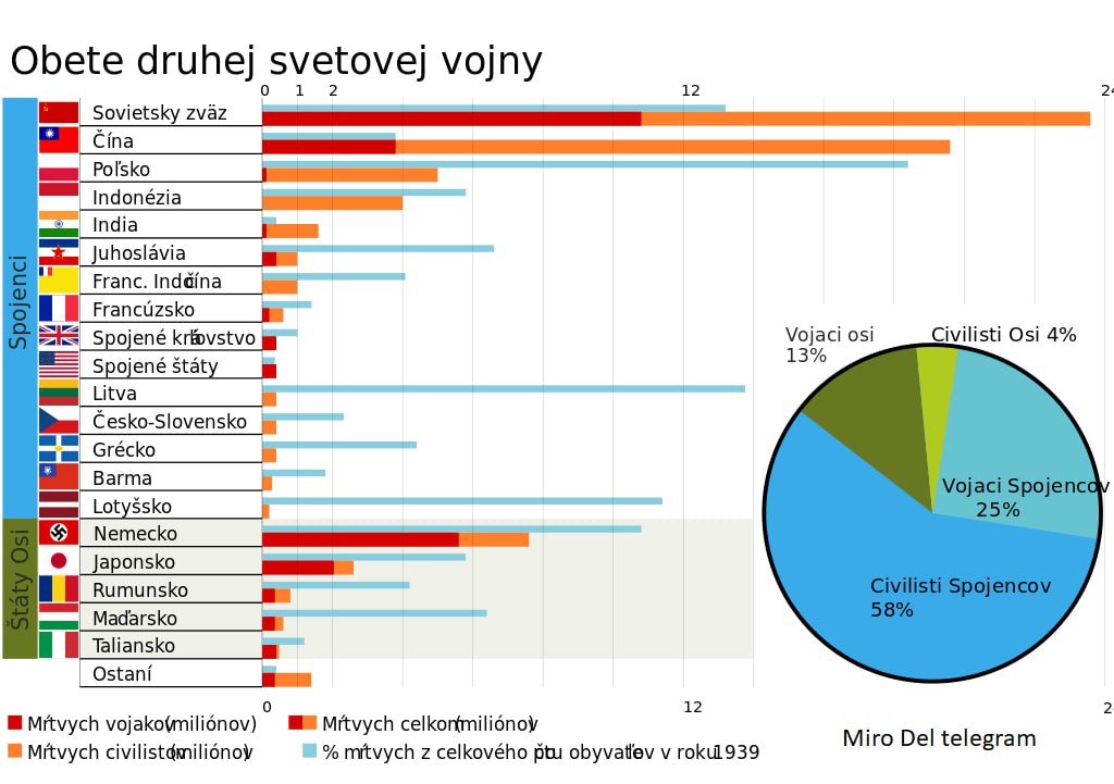 Zdroj https://t.me/Miro_Del/21823 z 05.02.2024Na Slovensku a hlavne v Čechách sa začína presadzovať názor, že to Američania vyhrali II. svetovú vojnu a len im vďaka. Dokonca sa objavujú tvrdenia, že nás oslobodili potomkovia kopáčov Čierneho mora a staviteľov pyramíd, lebo Ukrajinský front. Jeden liberálny idiot tvrdil, že Liptovský Mikuláš oslobodzovali americké tanky (videjko som kedysi také dával). Dokonca som ešte dávnejšie narazil na argumentáciu: Len po Okrajine žilo v roku 1940 41,3 milióna obyvateľov, pričom k 01..01.1945 ich bolo ani nie 27,4 milióna. Rozdiel – 13 917 000 ľudí – by potom mal tvoriť celkový počet okrajinských obetí, čo je vraj skoro 1/2 všetkých obetí v ZSSR. No do úvahy treba zobrať, čo autor neurobil, že drvivá občanov Okrajiny bola etnickí Rusi, veľmi veľa Židov umrelo, Banderovci vyrezali strašne veľa Poliakov.... Súťaž v počte obetí je strašne, ale totálne idiotská súťaž, pretože čísla z každej strany sú iné a nikto už pravdu nepozná.
