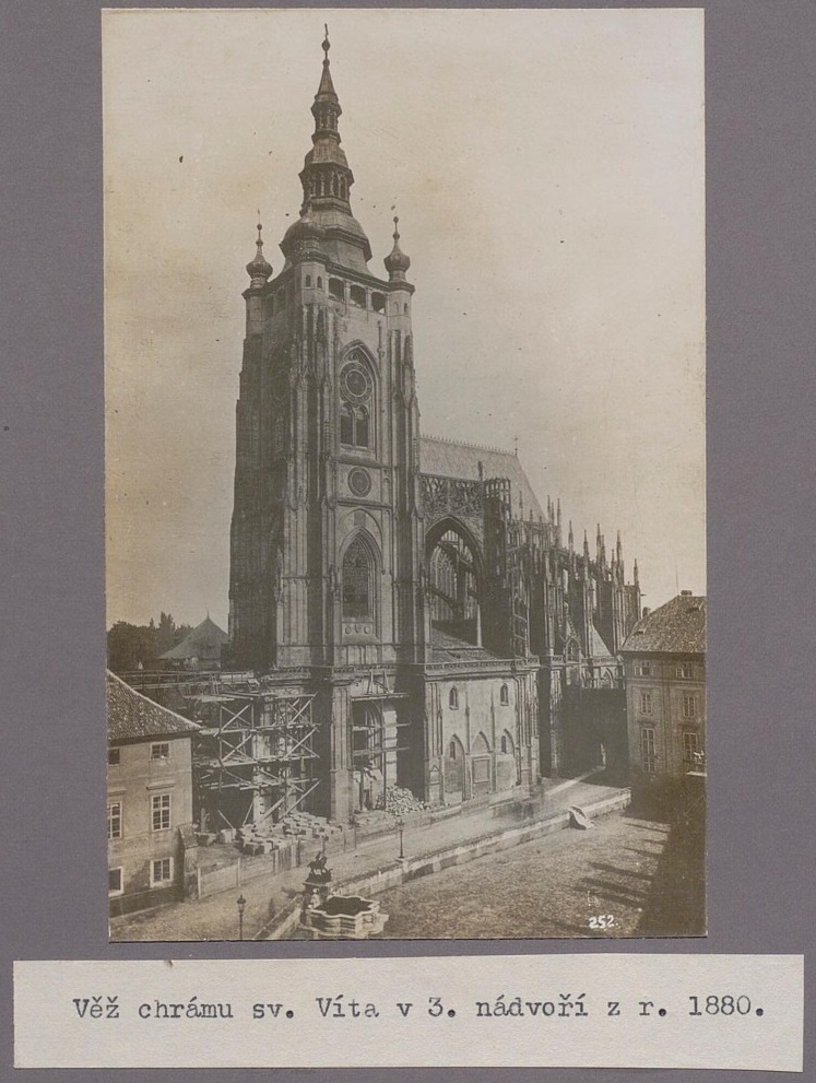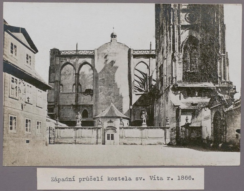 Aha, takže je to pohľad od prechodu z druhého nádvoria a stena za kaplnkou zakrýva terajší transcept. Ako vedel som, že v tej dobe bol Svatý Vít nedokončený, ale netušil som, že ho nebola ani polovica.