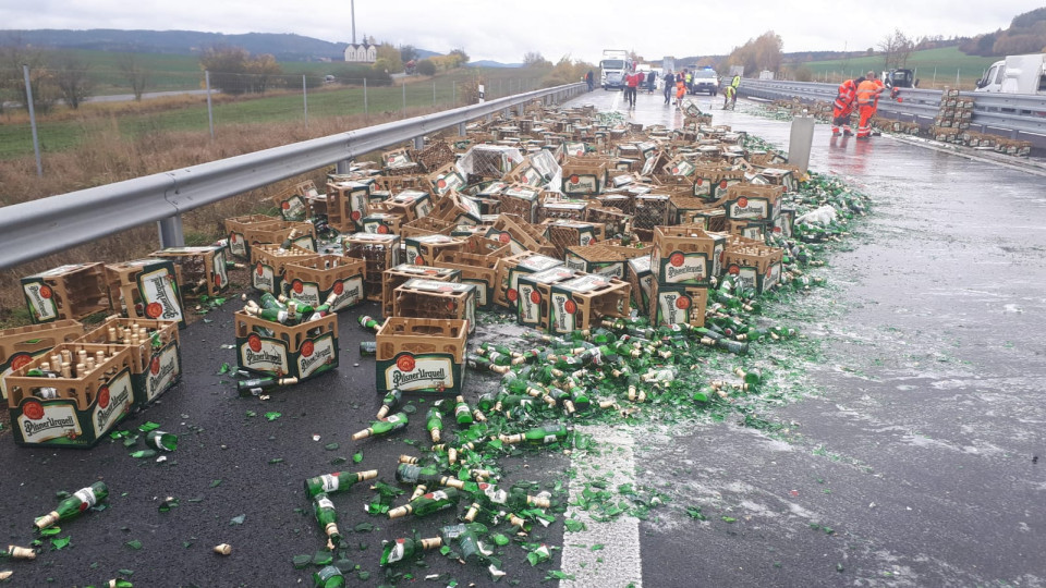 „Nákladní vozidlo vyjelo částečně mimo komunikaci, následně se vrátilo do jízdního pruhu a přitom se z něj vysypal přepravovaný náklad – přepravky s pivem,“ uvedla pro server iDnes.cz policejní mluvčí Hana Kroftová.Nehoda je bez zranění. Na místě probíhá odklízení vysypaného nákladu. Předpoklad uvedení do provozu je cca za 2 hodiny. pic.twitter.com/1KmIRNDqXQ