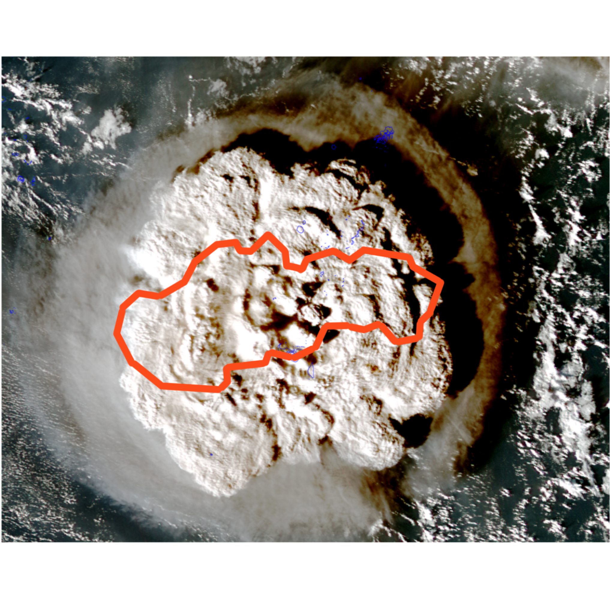 Merítko rozmerov - v "momente" oddelenia tlakovej vlny od vulkanického mraku má mrak priemer 300-400km (v 1:31 sa objaví záber s bielo zakreslenými ostrovmi súostrovia Tonga https://www.google.sk/maps/@-20.3652473,-174.7546295,8z vzdialenosti medzi ostrovmi sú cca 155 a 305km ).