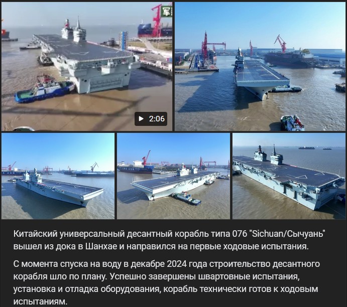 Video https://vk.com/video-123538639_456319551 dĺžka 2:06 min.Čínska univerzálna výsadková loď typu 076 „Sichuan“ opustila dok v Šanghaji a vydala sa na prvé plavebné skúšky.