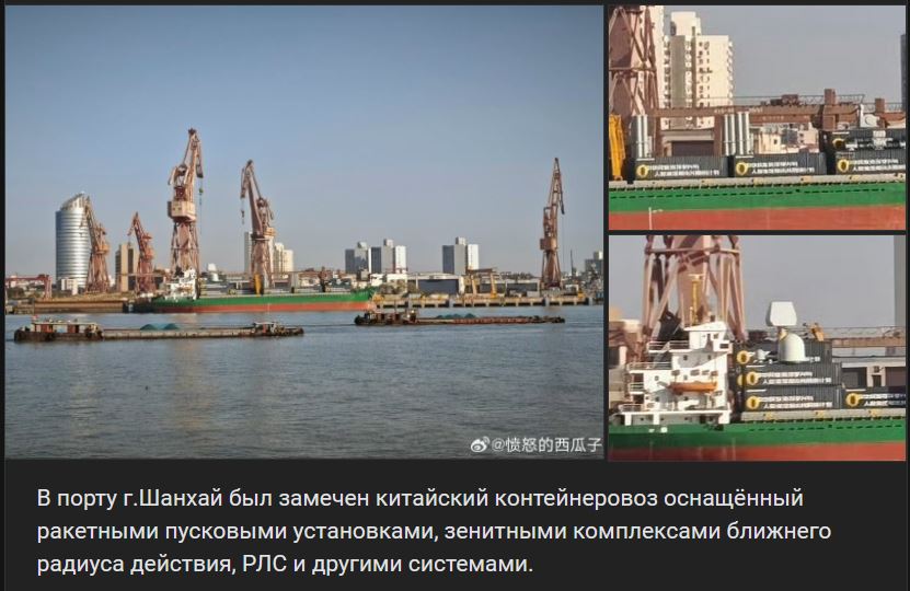Zdroj https://vk.com/wall-123538639_4774767 z 25.12.2025 Zdroj https://t.me/casusbellilive/237900 z 25.12.2025V prístave pri meste Šanghaj bol zaznamenaný čínsky kontajnerový lodný transport vybavený raketovými odpaľovacími zariadeniami, protivzdušnými komplexmi krátkeho dosahu, radarmi a inými systémami.