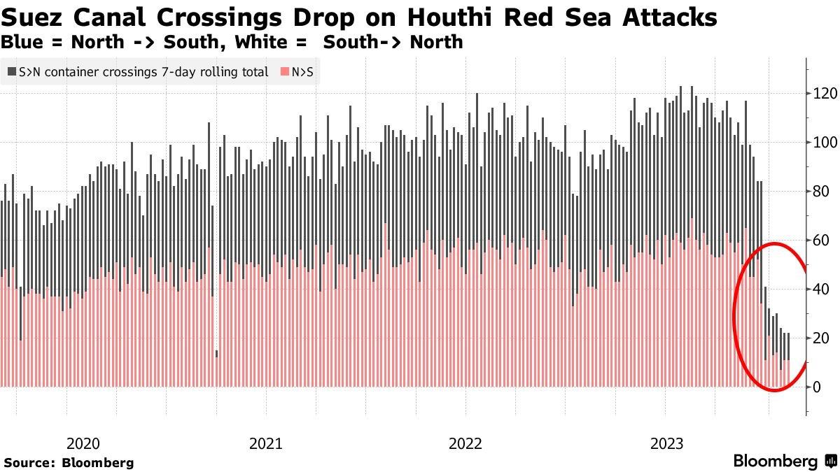 Graf príjmov Egypta zo Suezského prieplavu dobre ukazuje, ako účinne funguje "húsíjská blokáda" proti Izraelu, USA a Spojenému kráľovstvu.