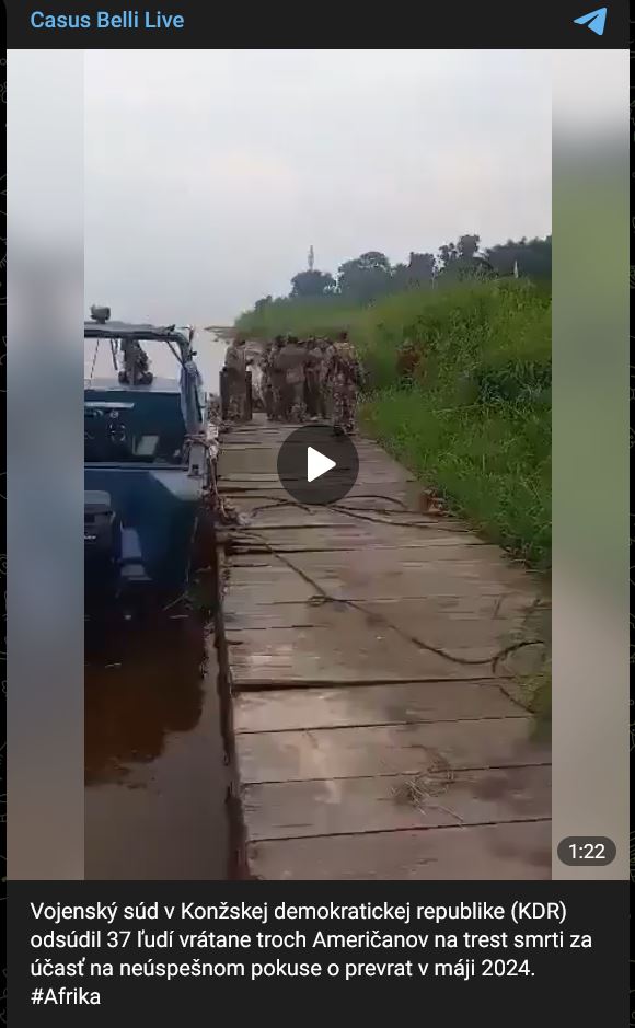 Zdroj https://t.me/casusbellilive/179347 / https://t.me/new_militarycolumnist/141543 z 15.09.2024Vojenský súd v Konžskej demokratickej republike (KDR) odsúdil 37 ľudí vrátane 3 Američanov na trest smrti za účasť na neúspešnom pokuse o prevrat v 05/2024.