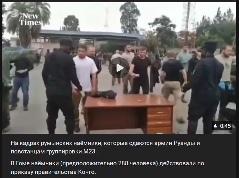Na záberoch rumunský žoldnieri, ktorí sa vzdávajú armáde Rwandy a povstalcom zo skupiny M23. V Gome žoldnieri (údajne 288 ľudí) slúžili na príkaz vlády Konga.