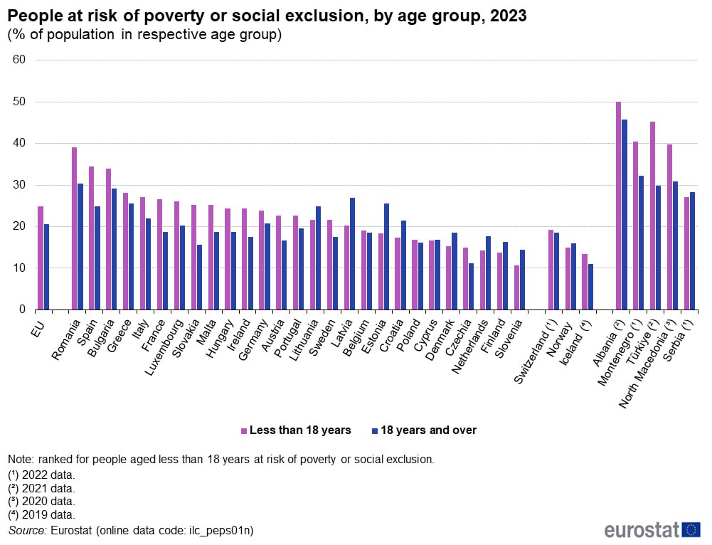 ▪️ 24,8 % dětí v EU bylo v roce 2023 ohroženo chudobou nebo sociálním vyloučením. Ve srovnání s předchozím rokem se tento údaj zhoršil o 0,1 %, uvádí (https://ec.europa.eu/eurostat/statistic ... y_findings) Eurostat.