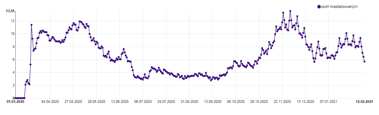 Vývoj podílu hospitalizovaných osob s laboratorně potvrzenou nákazou onemocněním COVID‑19