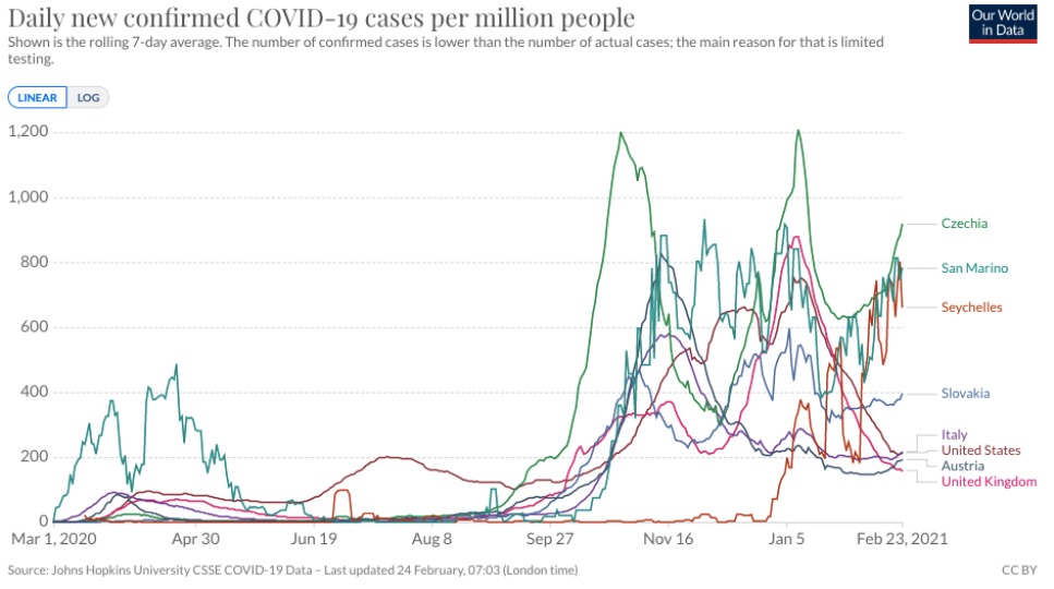 Česká republika je tak nyní s 918 nakaženými v přepočtu na milion obyvatel za posledních sedm dní v boji s koronavirem nejhorší na světě. Ukazují to data z webu Our World in Data. Předběhla i malé státy s obvykle vysokými průměry nakažených jako jsou Syechely nebo San Marino. Z okolních států je na tom nejhůře Slovensko s 395 případy. Polsko má aktuálně 197 případů, Rakousko 194 a Německo jen 89.