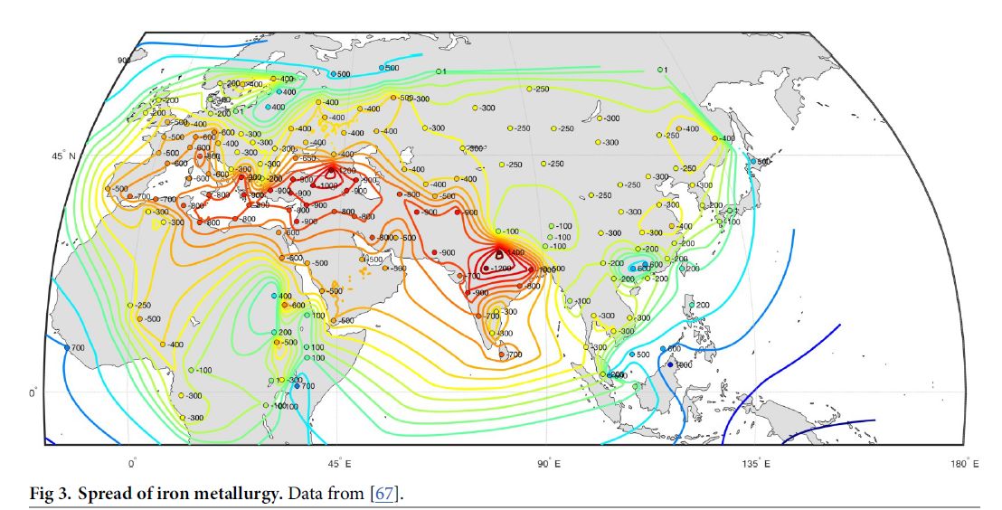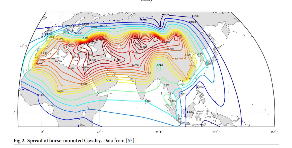 Druhou vecou je, aky bol vplyv ludi, ktori žili severnejšie na dejiny. No a ten vplyv bol velky. Najdôležitejšim počinom pre dejiny bolo použitie jazdy. Kon + jazdec + zbran formovali dejiny až do vynalezu gulometu. Druhou dôležitou okolnostou bolo použitie železa a tam tiež je velky vplyv ludi, ktori žili mimo kulturneho okruhu Egypta, Mezopotanie, alebo Grecka. Dve mapy. Jedna je o šireni vojenskej jazdy a druha o rozšireni železa.