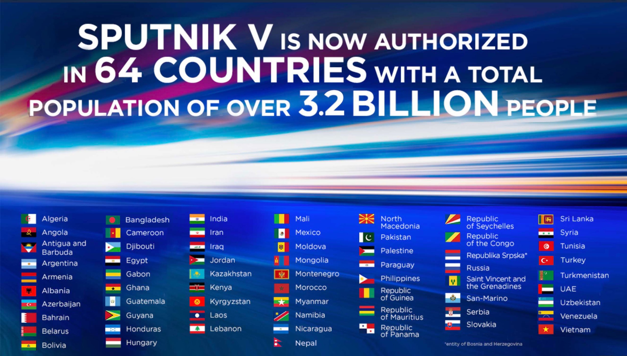 Ruská vakcína "Sputnik V" proti koronavírusom bola schválená už v 64 krajinách s celkovou populáciou viac ako 3,2 miliardy ľudí. "Sputnik V" je na 2. mieste na svete, čo sa týka počtu schválení, ktoré dostali vládne regulačné orgány. Účinnosť vakcíny bola podľa analýzy údajov od 3,8 miliónoch očkovaných Rusov 97,6%, čo je viac, ako údaje predtým publikované v lekárskom časopise The Lancet (91,6%), Ruskom fonde priamych investícií ( RDIF ) a agentúre Gamaleya.