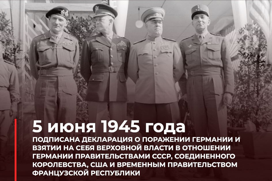05.06.1945 = pred 77-timi rokmi bola v Berlíne podpísaná Deklarácia o porážke Nemecka a prevzatí na seba najvyššej moci nad Nemeckom vládami ZSSR, Spojeného kráľovstva, SŠA a dočasnou vládou Francúzskej republiky. Dokument podpísali: maršal Sovietskeho zväzu Georgij Žukov (Георгий Жуков) + poľný maršal Bernard Law Montgomery + armádny generál Dwight David Eisenhower + generál Jean-Marie-Gabriel De Lattre De Tassigny.
