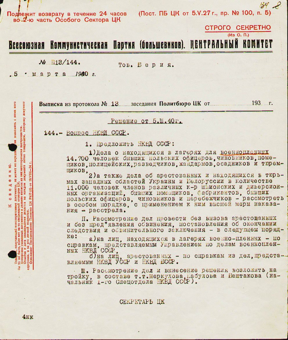 Později E. P. Molokov prokázal, že strojopisné písmo prvních tří stran Berijova dopisu č. 794/B (ty, které se týkají poprav polských občanů) se nenachází v žádném z dosud známých autentických dopisů sovětského komisaře vnitra z let 1939-40.