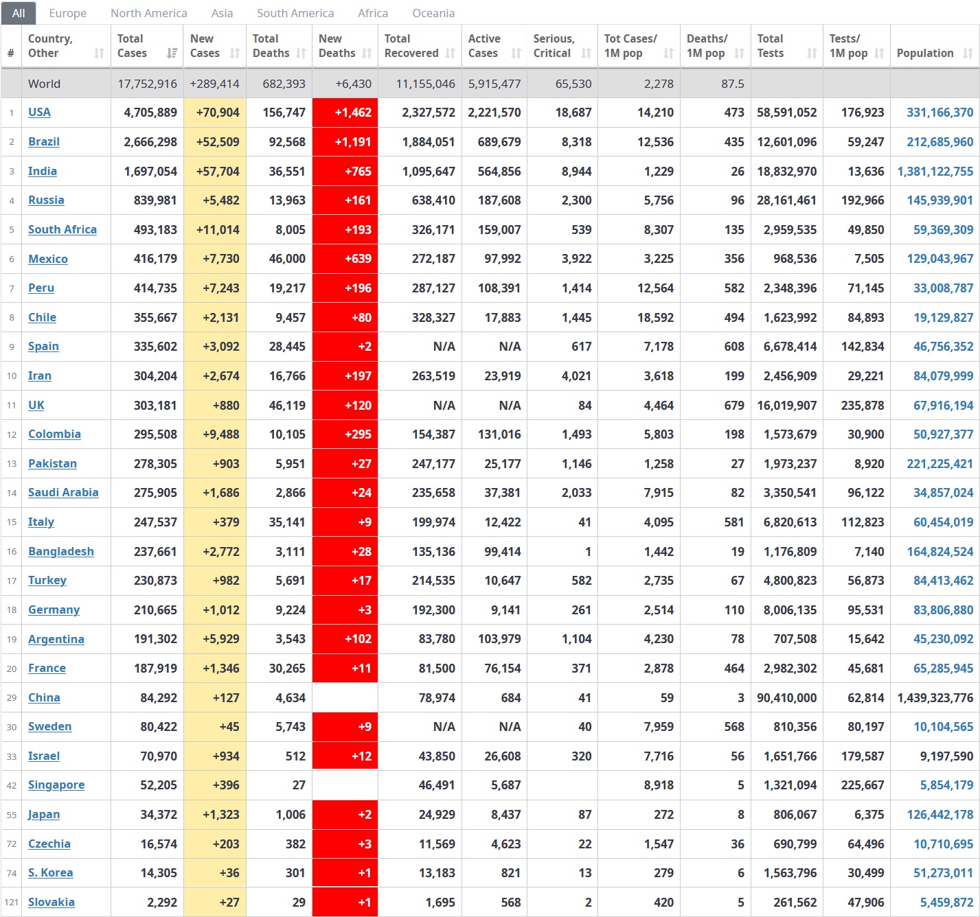 Nejhůře postižené jsou Spojené státy, které dosud zaznamenaly téměř 4,3 milionu nakažených a 148.000 úmrtí s covidem-19. Druhý nejvyšší počet nakažených eviduje Brazílie, kde se zatím potvrdilo 2,4 milionu případů nákazy a na 87.600 úmrtí s covidem-19. Reálné počty jsou ale vyšší, protože tato největší latinskoamerická země málo testuje.