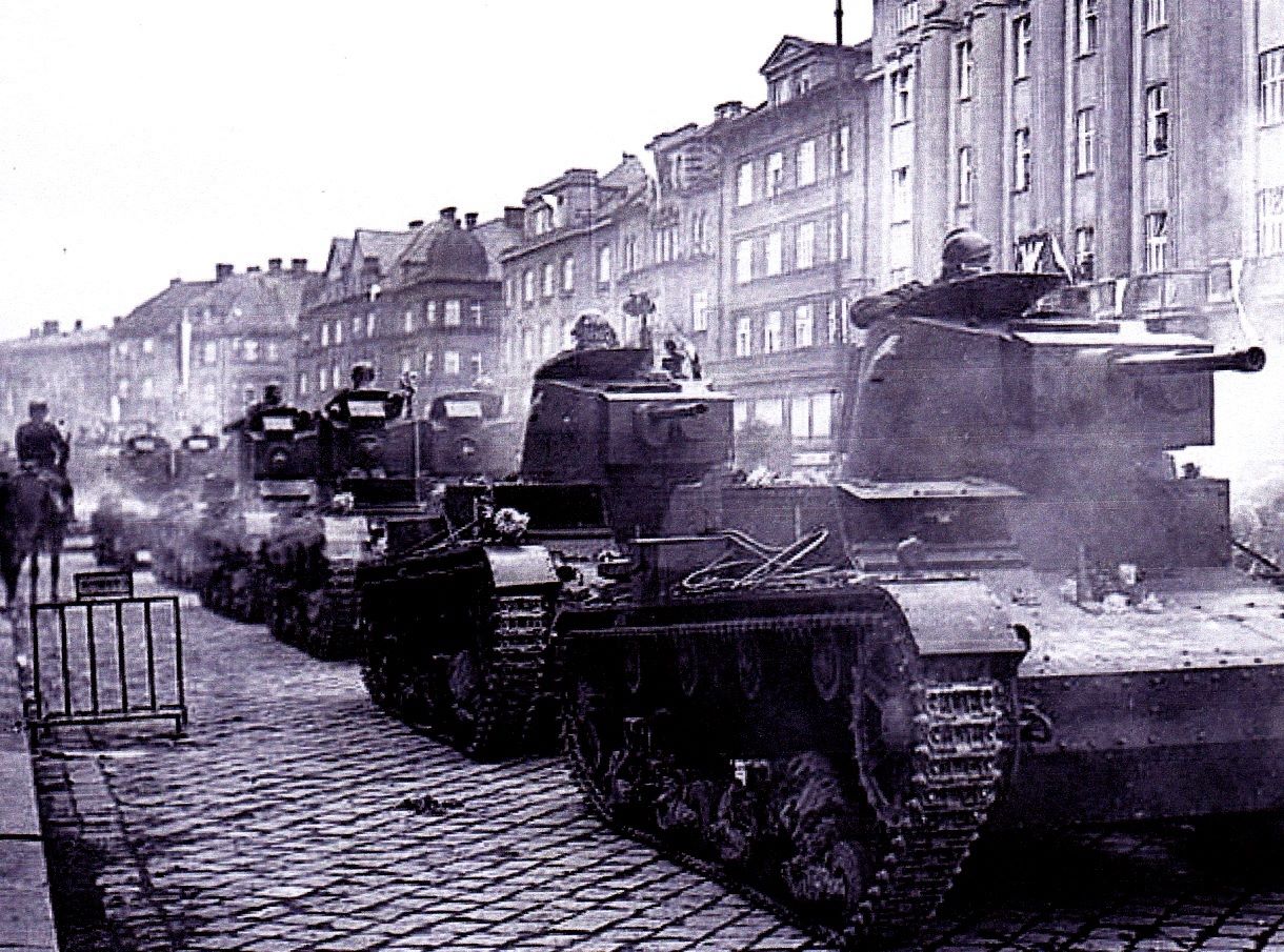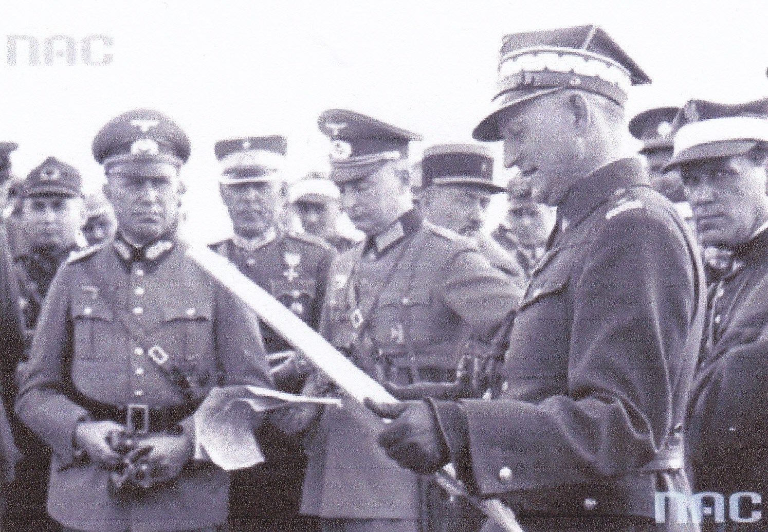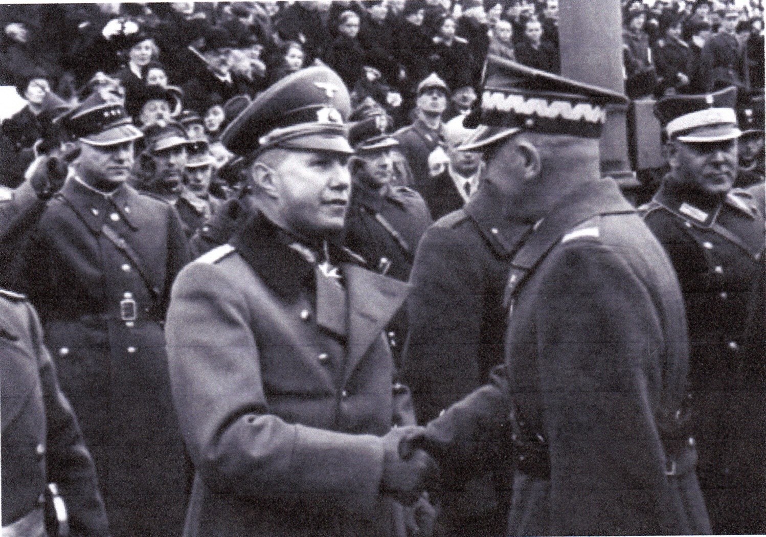 Polský maršál Edward Rydz – Smigli si potřásá rukou s německým atašé plukovníkem Bogislawem von Studnitz na přehlídce ve Varšavě 11. 11. 1938. Stejná přehlídka proběhla o měsíc dříve po obsazení Těšína.