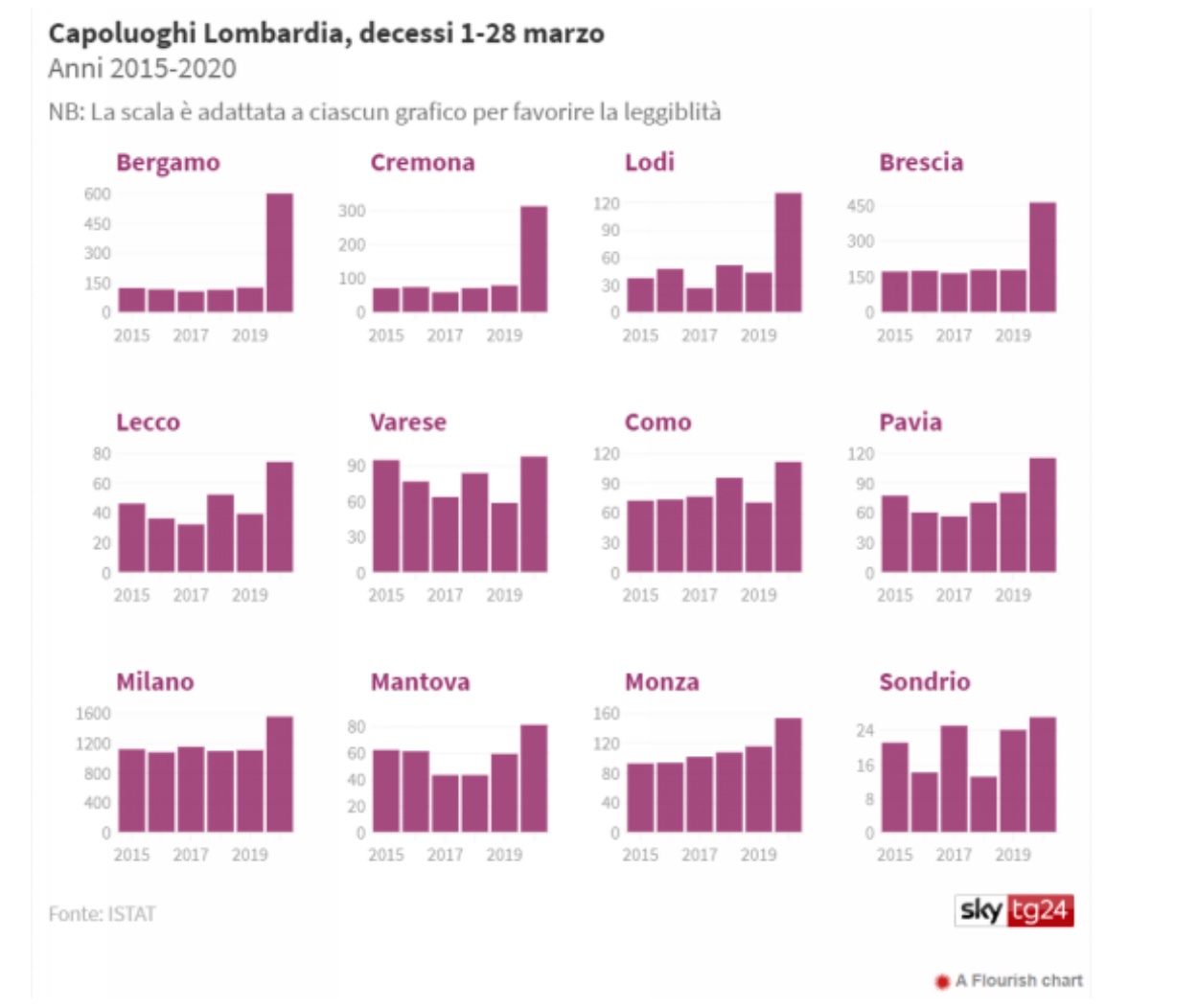 Národní statistický institut v Itálii přinesl analýzu dat úmrtí od ledna do 28. března 2020 v porovnání s průměrem za stejné období 2015-2019 v Lombardii. Ve 33 malých obcích se podle analýzy úmrtnost v březnu zvýšila více než desetkrát ve srovnání s průměrem za stejné období 2015-2019.